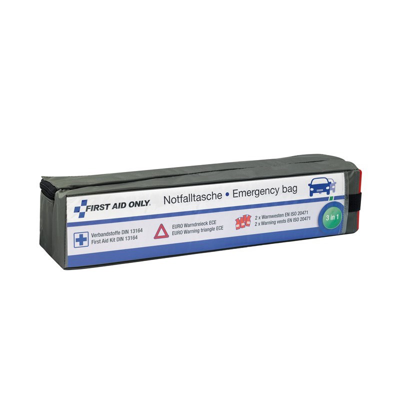 Praktična 3-u-1 torba za slučaj nužde za automobil. Sadrži obloge prema DIN 13164: razni zavoji, oblozi, maramice, flasteri, pokrivač za spašavanje, škare za prvu pomoć, rukavice za jednokratnu upotrebu, knjižica prve pomoći i listu proizvoda. Sadrži 2 prsluka velike vidljivosti u skladu s EN ISO 20471. Uključuje sklopivi EURO ECE trokut upozorenja.