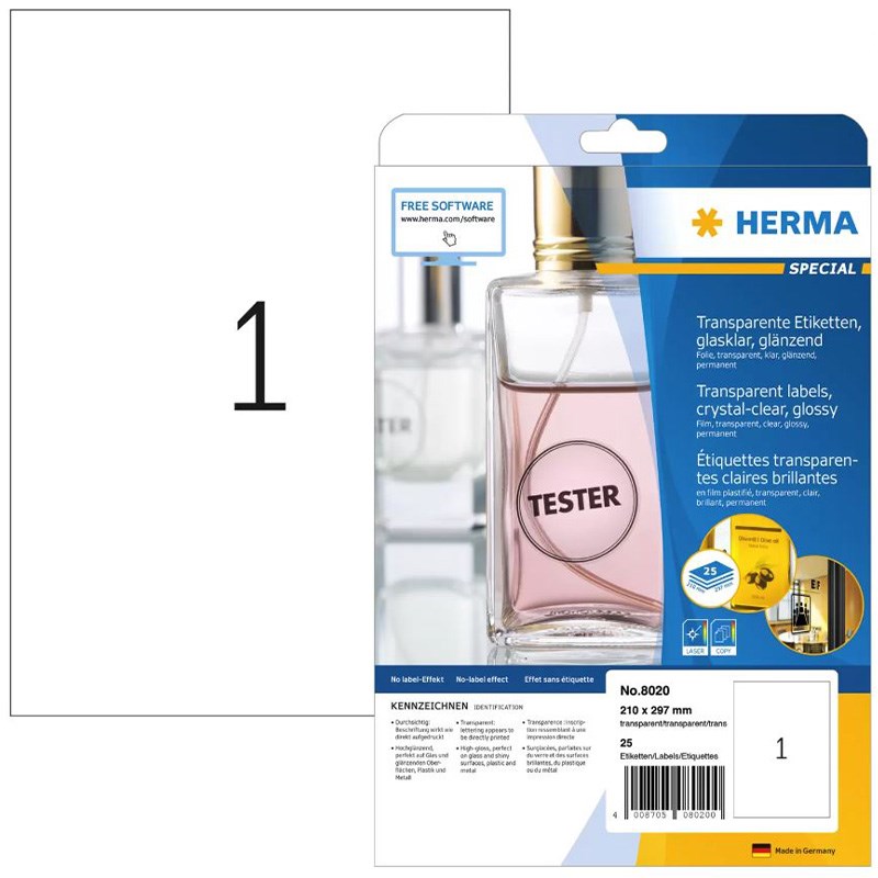 Kristalno prozirne samoljepive etikete na A4 arcima. Visoki sjaj, savršen za primjene gdje je vizualni izgled posebno važan. Idealno za staklo i sjajne površine od plastike, metala i obojene podloge.