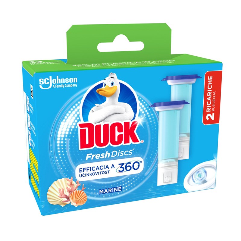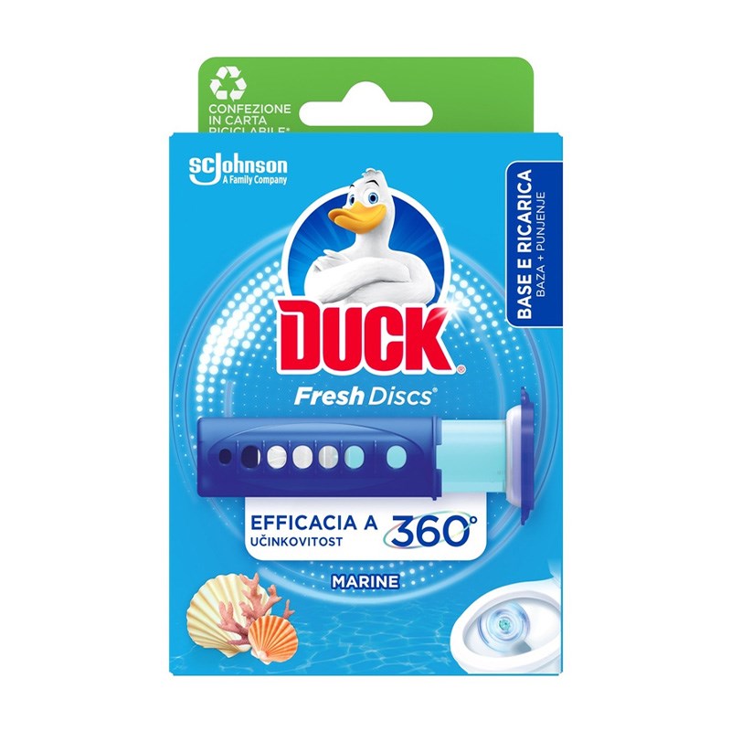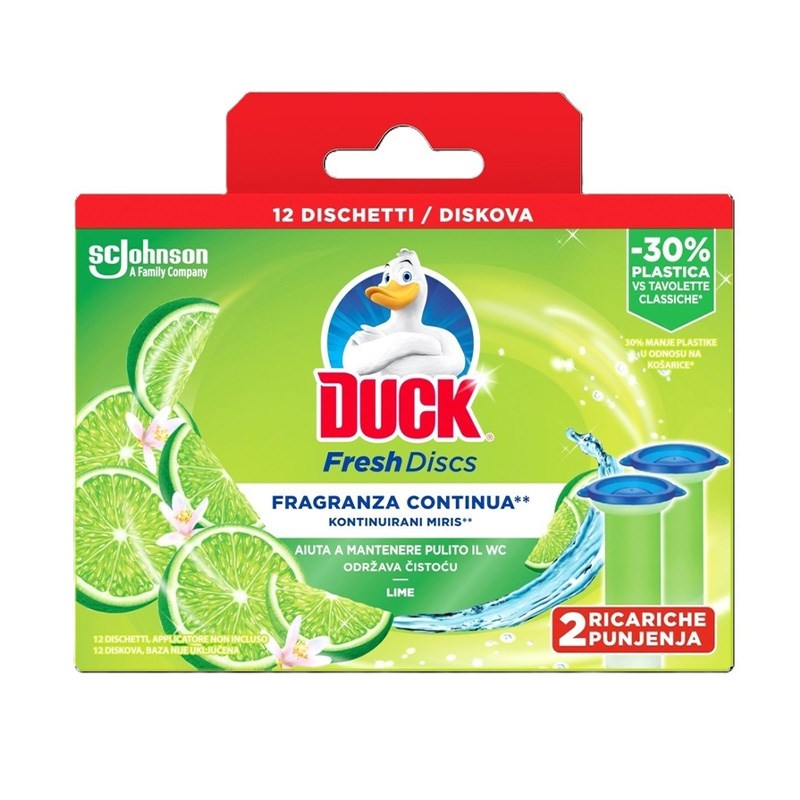 Duck® Fresh Discs ima formulu na bazi gela koja se sama lijepi za WC školjku. Osvježivač sprječava nakupljanje kamenca i mrlja koje sadrže klice. Samo ga zalijepite za unutarnji rub WC školjke. Bez upotrebe košarica.