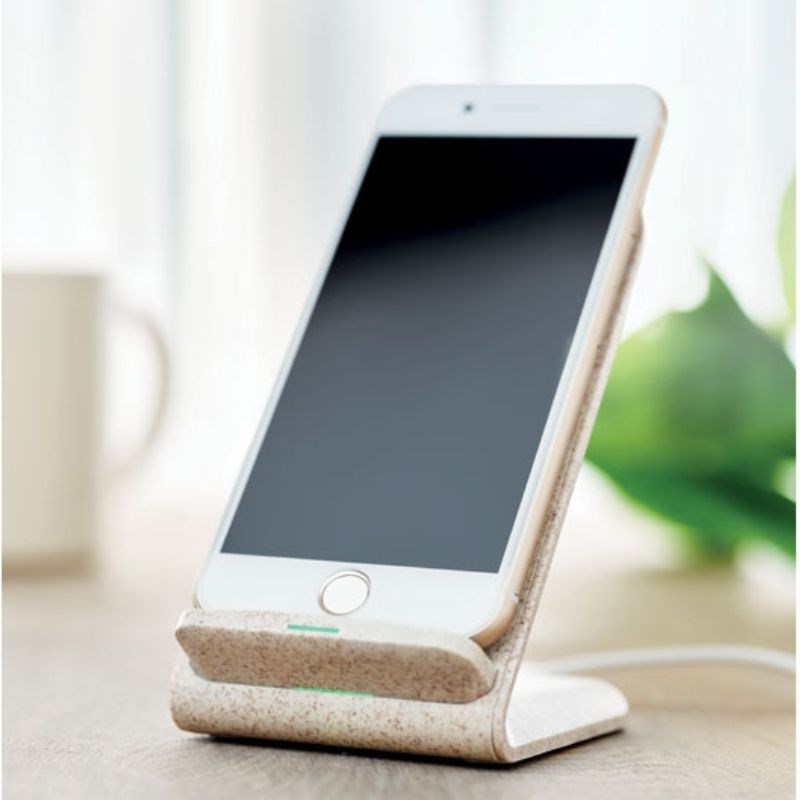 Stalak za mobitel s bežičnim punjačem od 5% pšenične slame i 65% ABS. Stavite pametni telefon na njega da biste započeli punjenje. Izlaz: DC5V/2A (10W) za brzo punjenje. Kompatibilan s najnovijim Androidima, iPhone® 8, X i novijim.