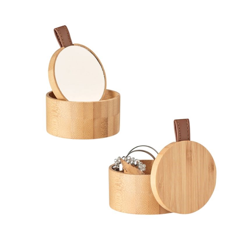 Mala bambusova kutija za nakit s odvojivim ogledalom. Čuvajte svoje naušnice, narukvice, ogrlice i prstenje na sigurnom mjestu u ovoj elegantnoj kutiji za nakit prirodnog izgleda. Unutrašnjost poklopca ima malo ogledalo.