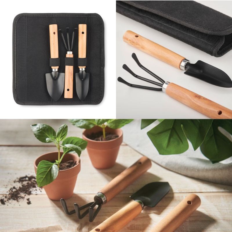 Set od 3 vrtna alata. Drljača i 2 lopate. Predstavljeno u RPET vrećici od filca s kukicom i izgledom.