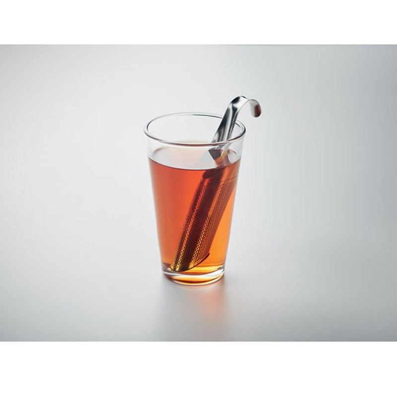 Set infuzera za čaj od cijevi od nehrđajućeg čelika za višekratnu upotrebu u pamučnoj vrećici. Uključuje filtar za čaj s kompaktnom i zakrivljenom kukicom koja mu omogućuje da visi preko ruba šalice ili šalice i četku za čišćenje.