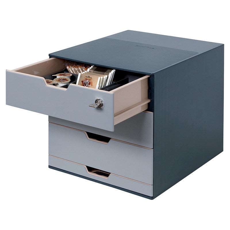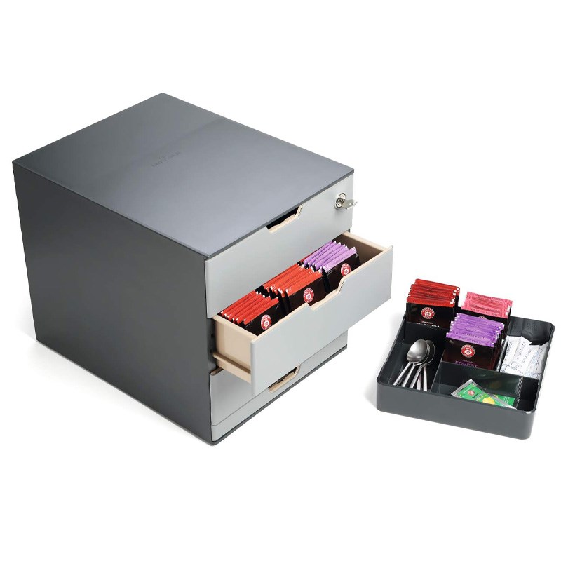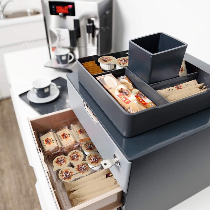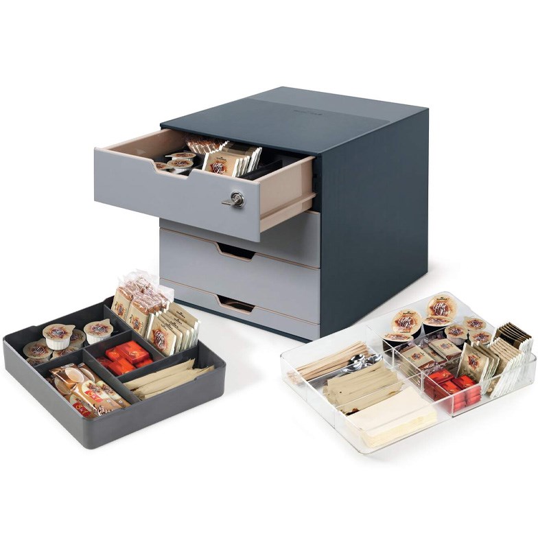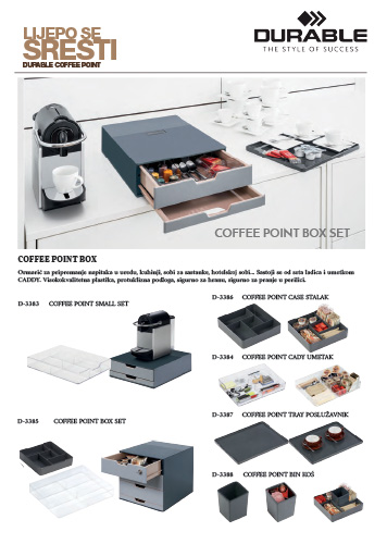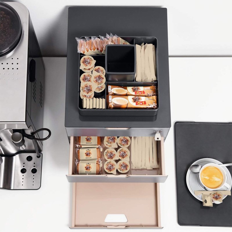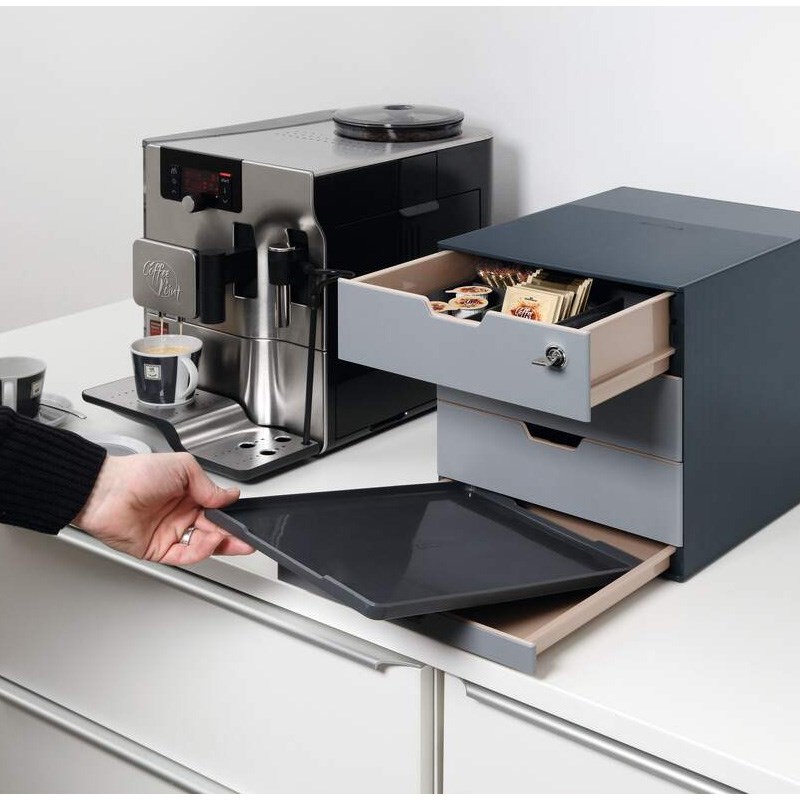 Ormarić za pripremanje napitaka u uredu, kuhinji, sobi za sastanke, hotelskoj sobi i dr. Sastoji se od seta ladica sa zaključavanjem i umecima COFFE POINT CASE i CADDY. Visokokvalitetna plastika (ABS), protuklizna podloga, sigurno za hranu, sigurno za pranje u perilici.