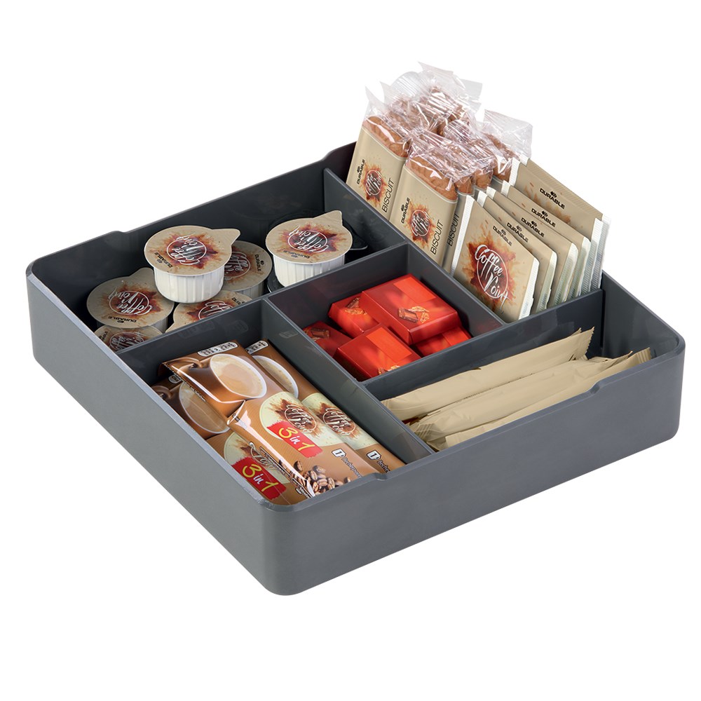 Praktično za odlaganje: vrećica instant kave, vrećica čajeva, paketića šećera, žličica, štapića za miješanje, čokoladica i dr.