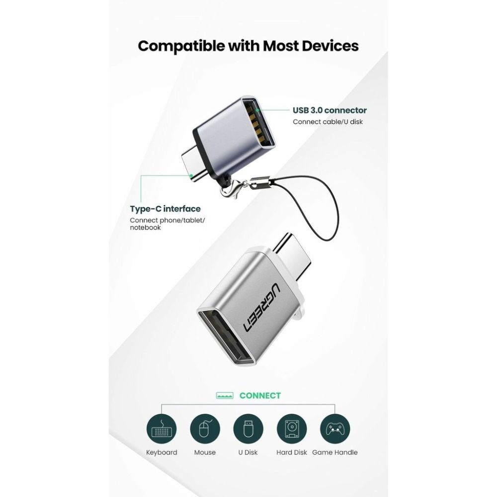 USB-C OTG adapter omogućuje vam povezivanje USB C mobilnog uređaja s USB On The Go funkcijom na USB A periferni uređaj kao što je USB flash pogon, pogon za olovku, tipkovnica, kontroler za igre, bežični miš ili čak neki čitač SD TF kartica.
