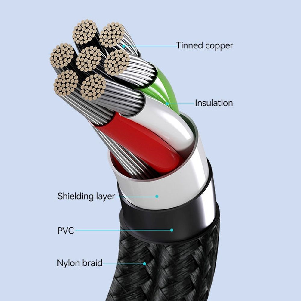 Kabel ima visokokvalitetne vrhunske unutarnje jezgre od na oksidaciju otpornih kositrenih bakrenih žica prekrivene izdržljivim najlonskim pletenim omotačem koji je čvrst i mekan te se odupire svakodnevnom petljanju i lako podnosi zahtjeve svakodnevne upotrebe, što obećava impresivnu dugotrajnost