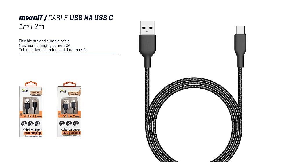 Kabel za povezivanje USB-A na USB-C za brzu punjenje i brzi prijenos podataka. Fleksibilni pleteni, izdržljivi kabel. Struja punjenja 3A.