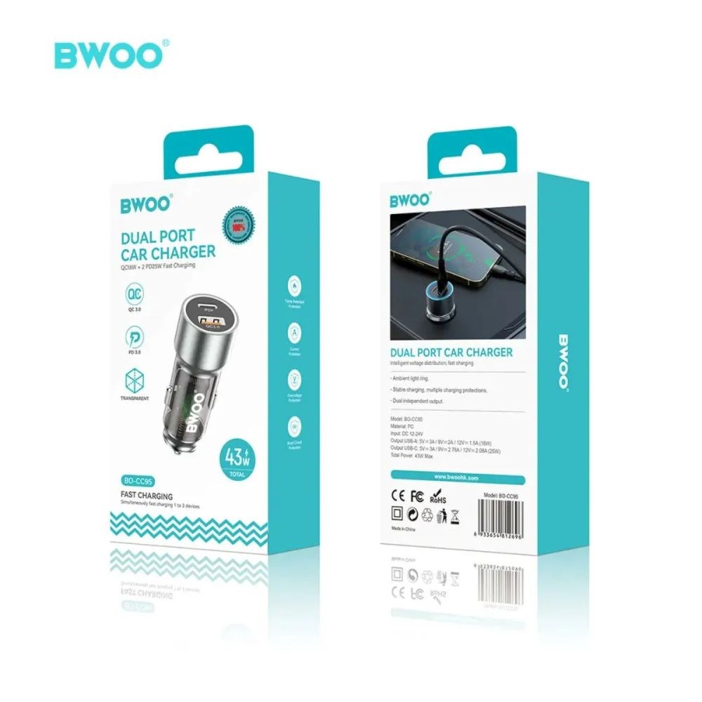 Ovaj BWOO 45W USB-C auto punjač isporučuje ukupnu snagu od 38W i podržava PD i QC protokole za brzo punjenje širokog spektra uređaja
