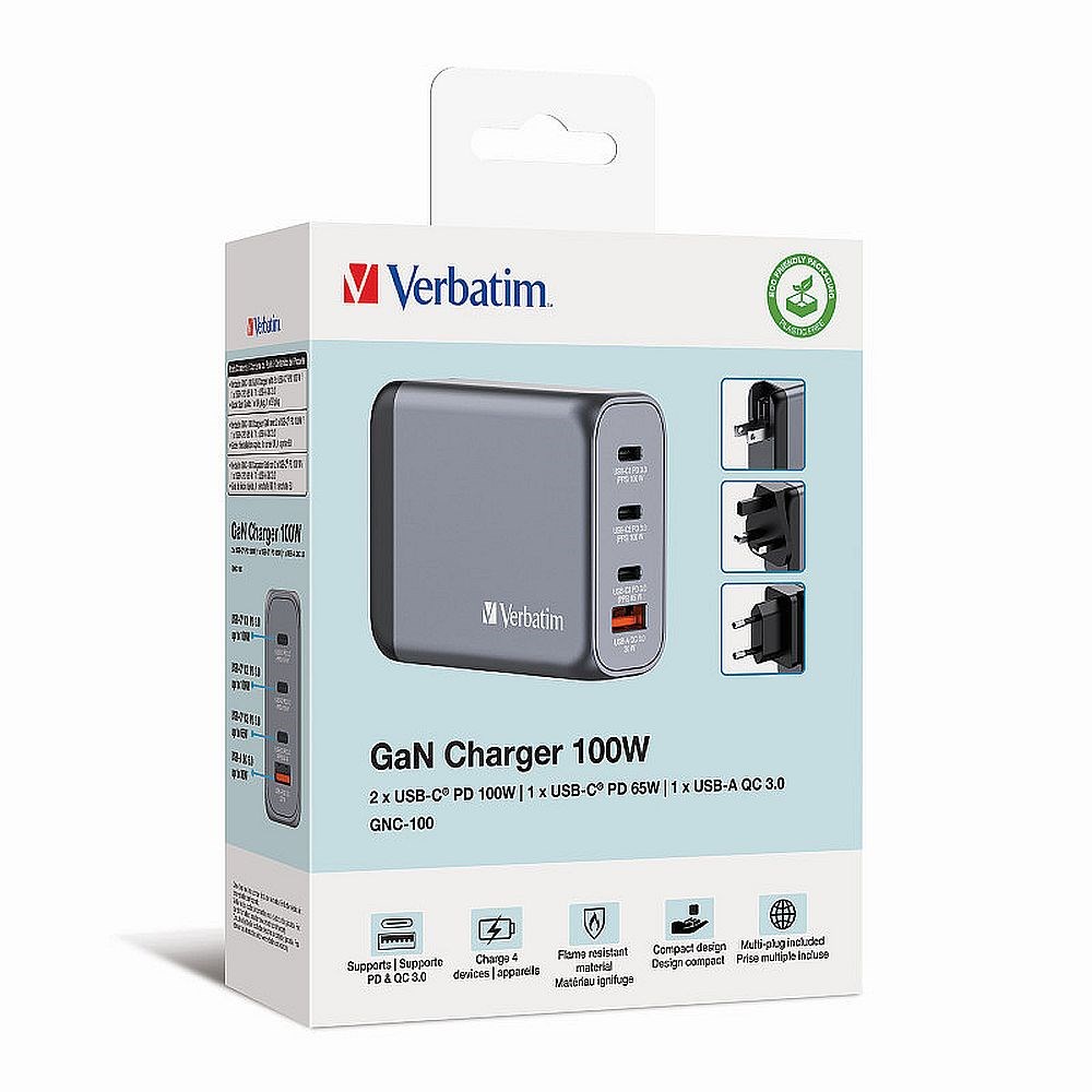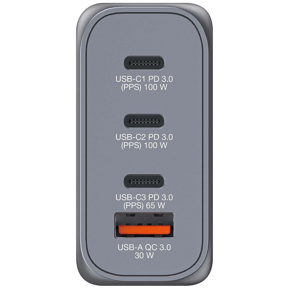 GaN zidni punjač od 100W objedinjuje više punjača u jednom, kombinirajući dva USB-C PD 100 W priključka, jedan USB-C PD 65 W priključak i jedan USB-A QC 3.0 (EU/UK/US) priključak u elegantnom dizajnu veličine dlana.