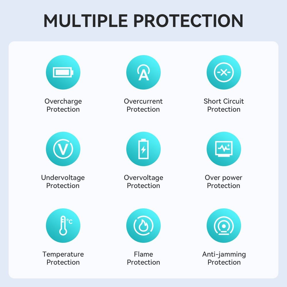 Devet sigurnosnih postavki, poput zaštite od prepunjavanja, zaštite od prenapona, zaštite od kratkog spoja itd., štite vaše uređaje od potencijalnih opasnosti tijekom punjenja, pružajući sigurnije i pouzdanije iskustvo punjenja