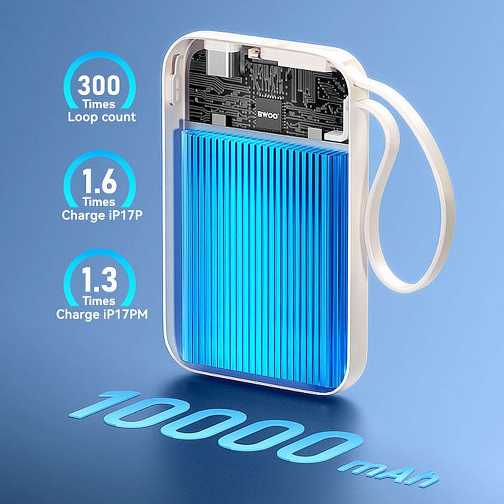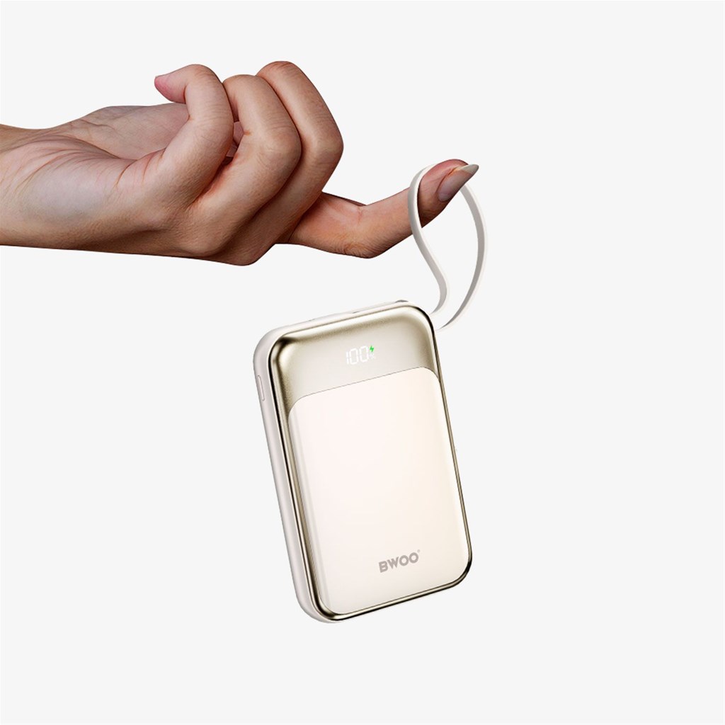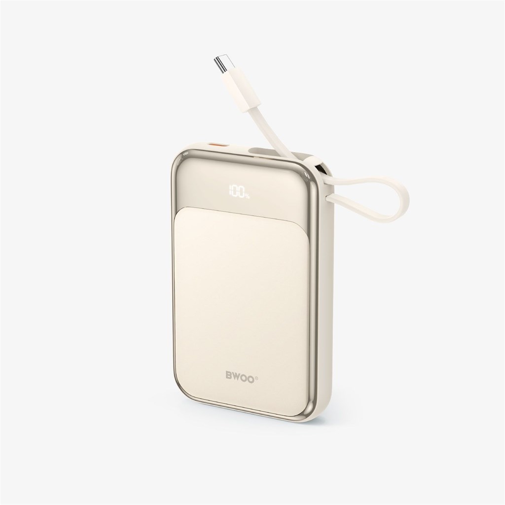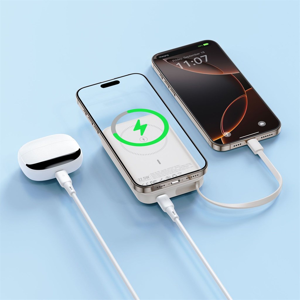 Magnetno bežično prijenosno napajanje s ugrađenim USB-C kabelom za punjenje uz koji ima mogućnost priključka još jednog USB-C kabela.
