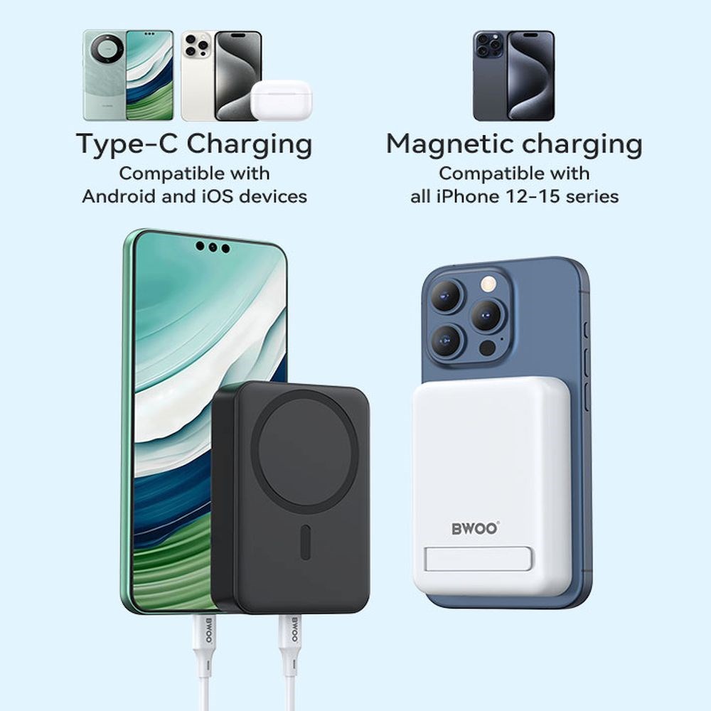 BWOO P59 Mag Safe Power Bank od 10000 mAh može raditi s magnetskim bežičnim punjenjem od 15 W ili preko USB-C priključka koji omogućuje dvosmjerno punjenje i može ponuditi maksimalnu izlaznu snagu od 20 W.