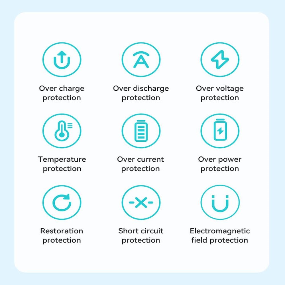 Tehnologija pametnih čipova osigurava brzu i stabilnu isporuku energije, optimizirajući energetsku učinkovitost i sprječavajući pregrijavanje te osugurava više ugrađenih sigurnosnih zaštita; štiti uređaje od prekomjernog punjenja, prekomjernog pražnjenja, kratkih spojeva i fluktuacija napona.