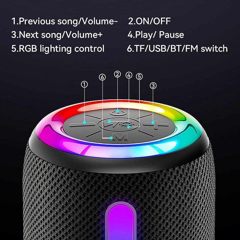 Kontrole na gornjoj ploči: Kontrola glasnoće/prijašnj i sljedeća pjesma, RGB, On/Off, Play/Pause, TF/USB/BT/FM prekidač