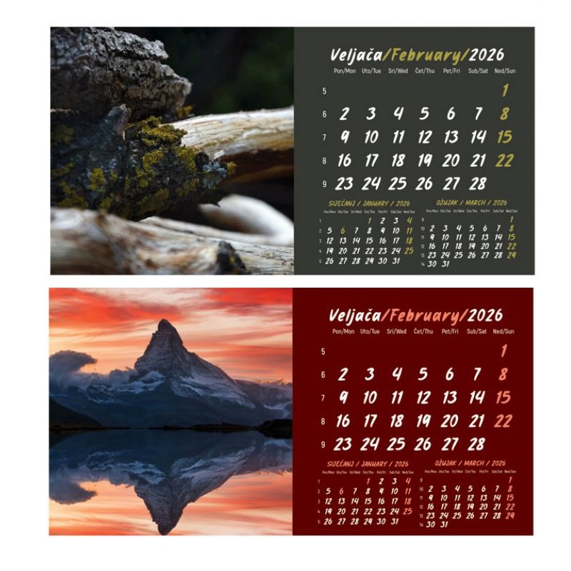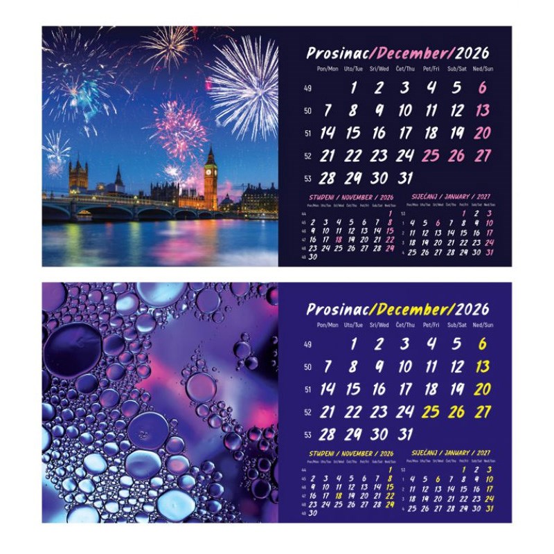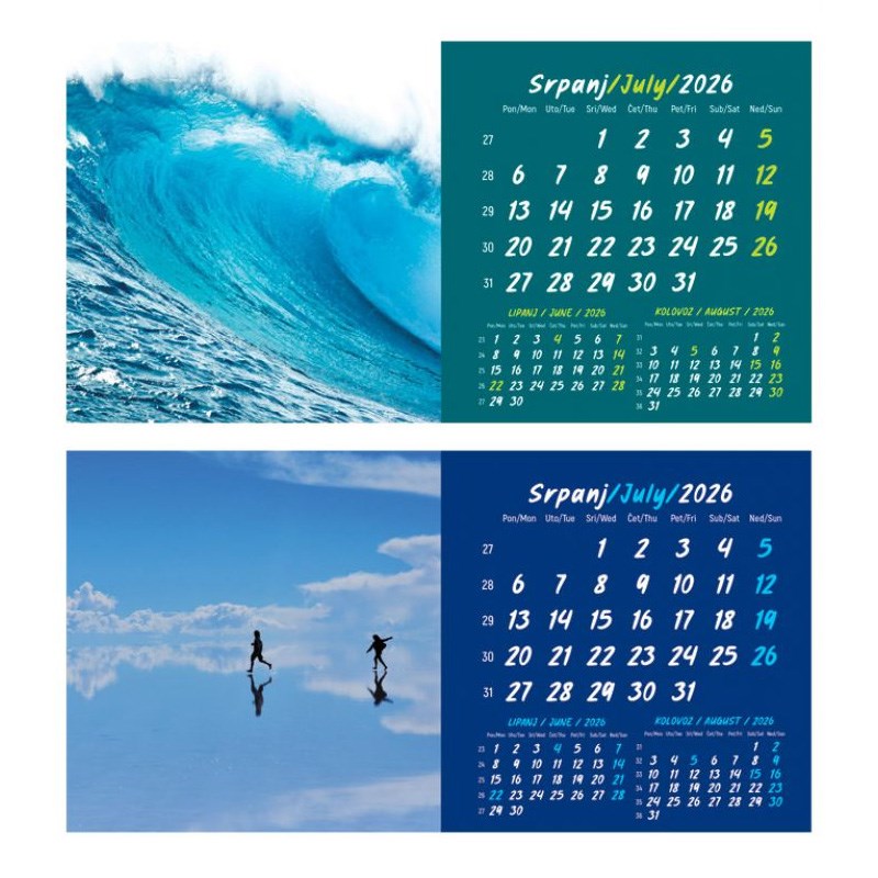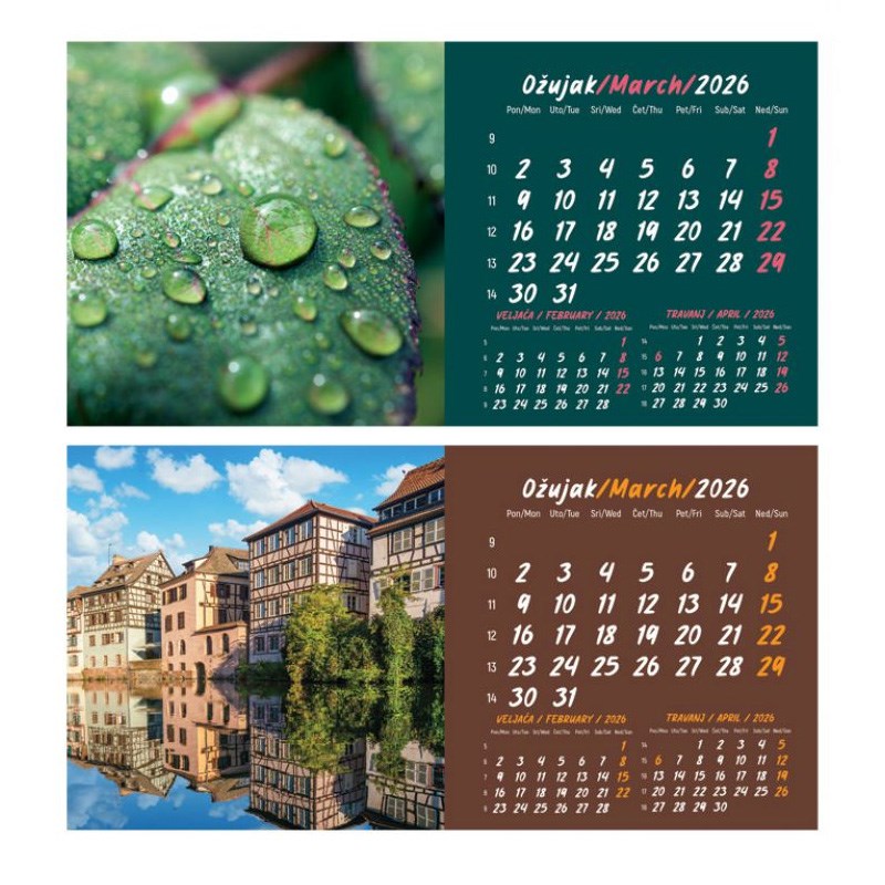 Kalendar stolni mali, obostrani sa spiralom. Dimenzije: 20,5 x 10,5 cm, prostor za dotisak -3 cm. S kuvertom