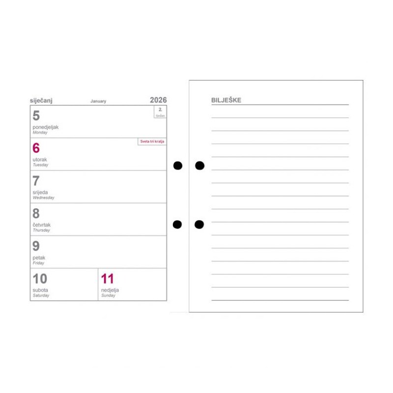 Uložak za stolni kalendar s posebnim rupama od 4,5 cm. Tjedan na jednom listu, na drugom za bilješke.