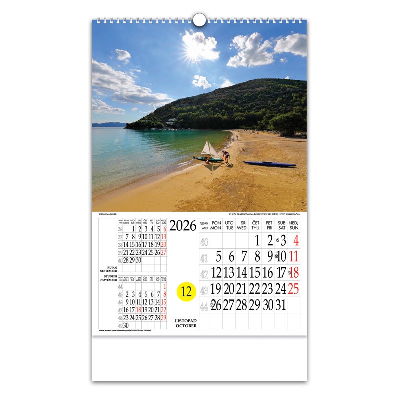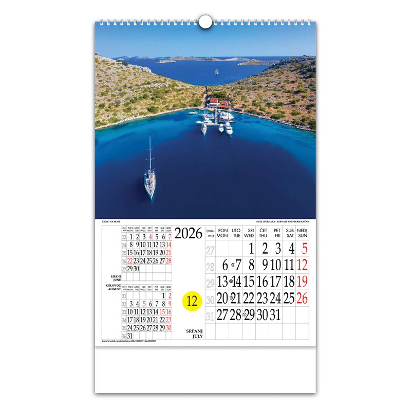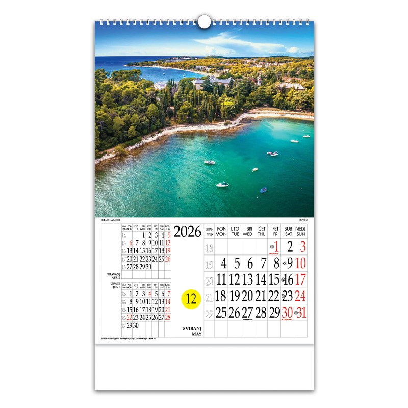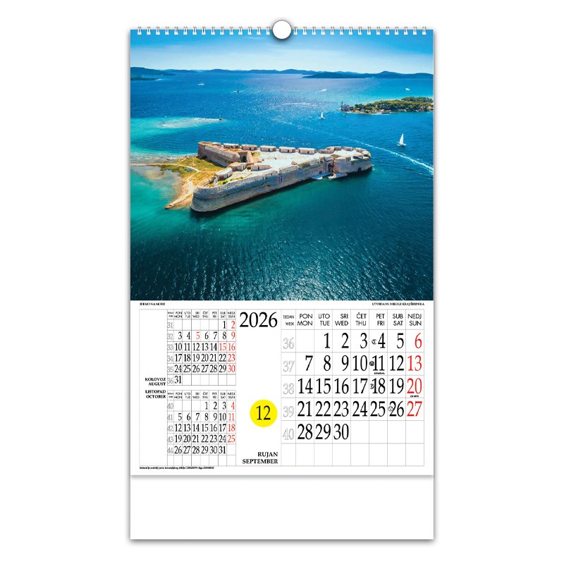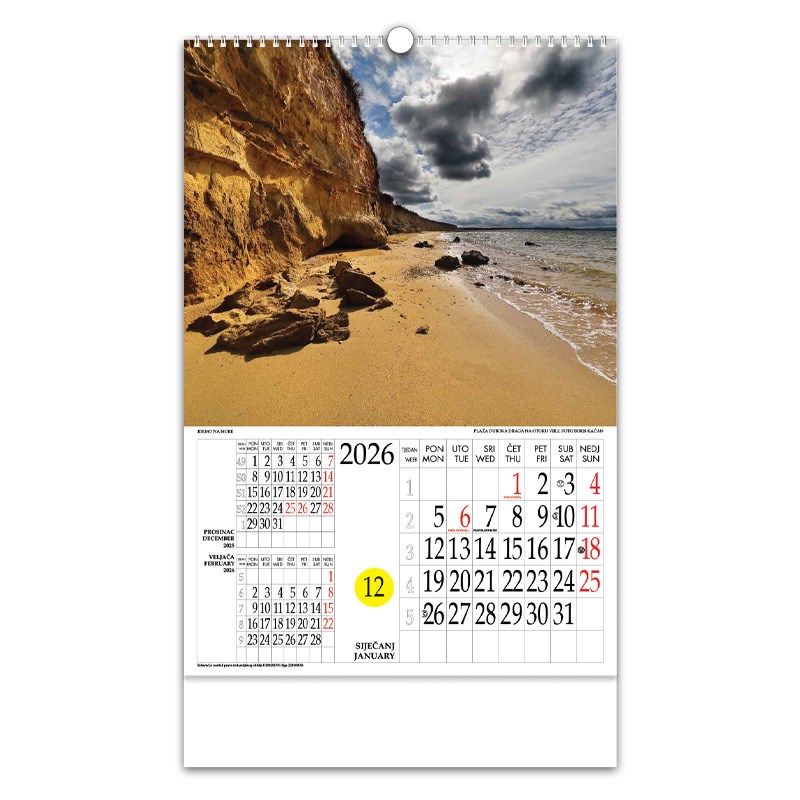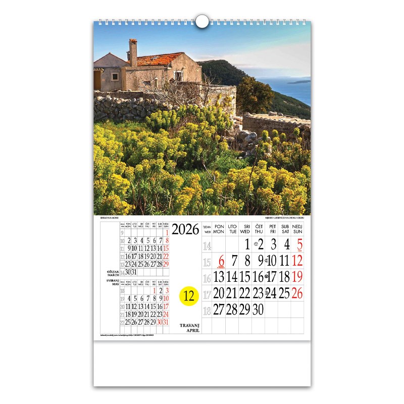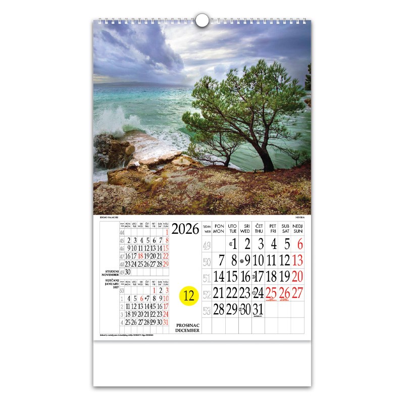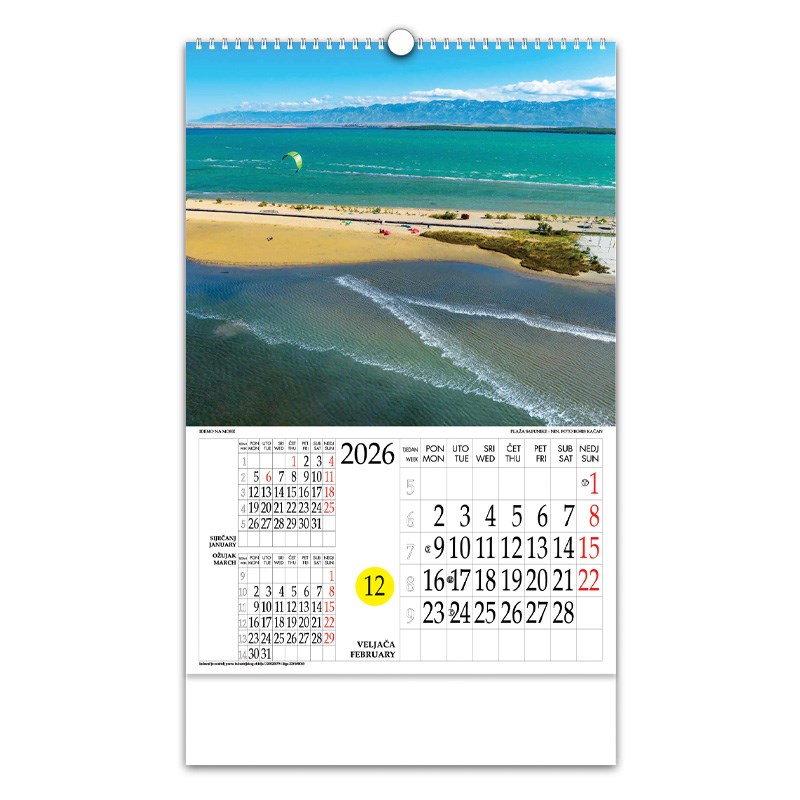 Na kalendaru se nalazi prozorčić s oznakom trenutnog mjeseca. Spiralni uvez, 1 mjesec - 1 list.