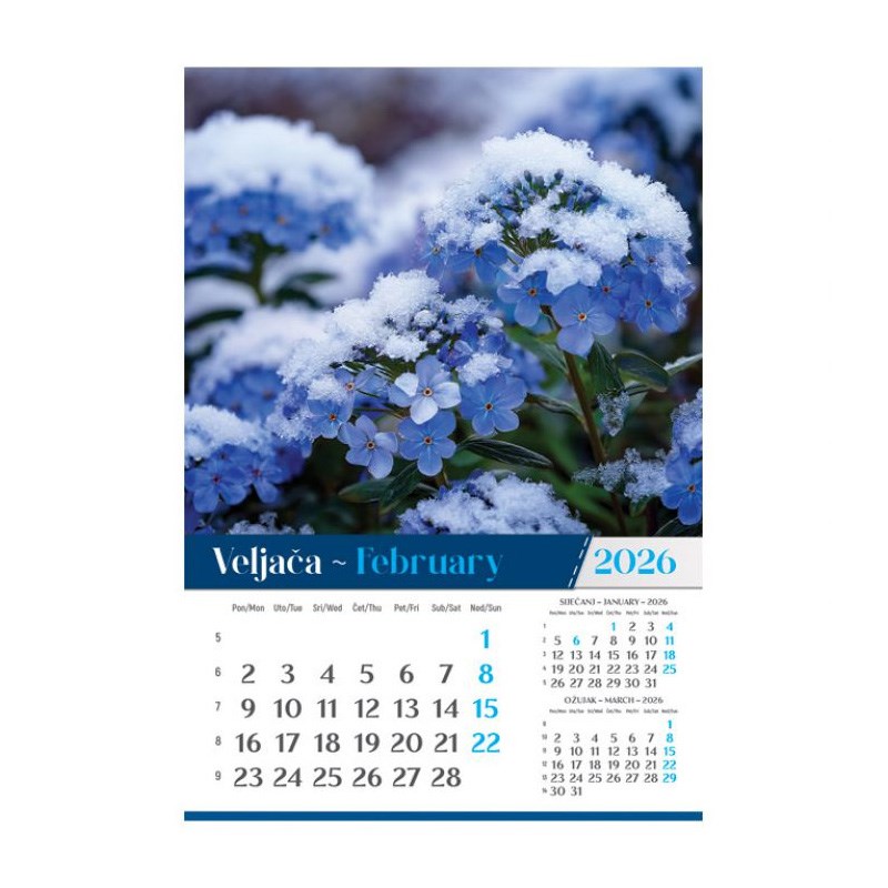 Zidni kalendar od 13 listova sa spiralom; dimenzija: 33x48 cm; pasica za dotisak 6 cm.