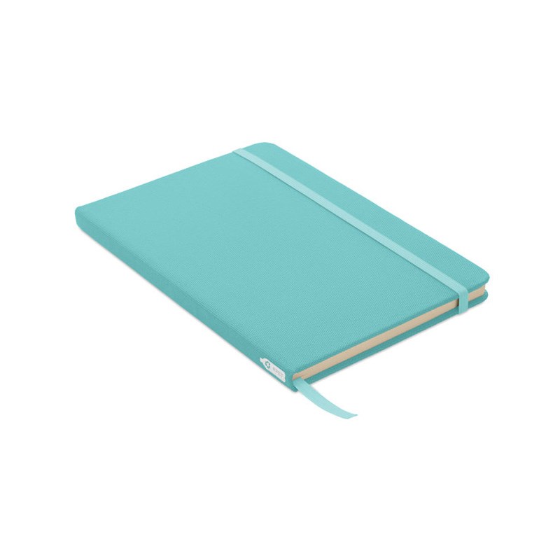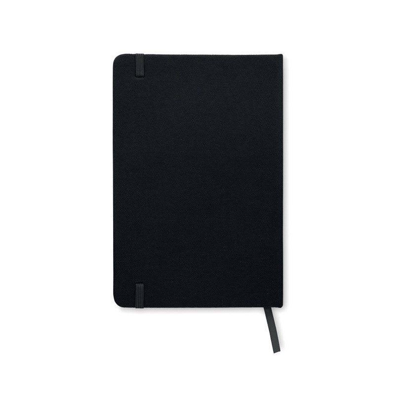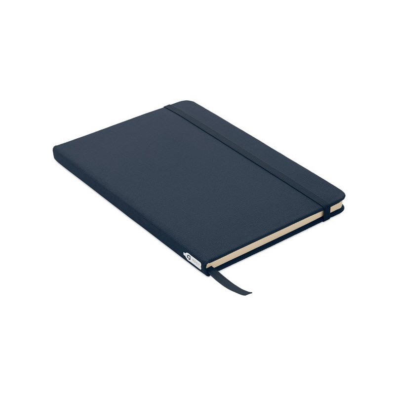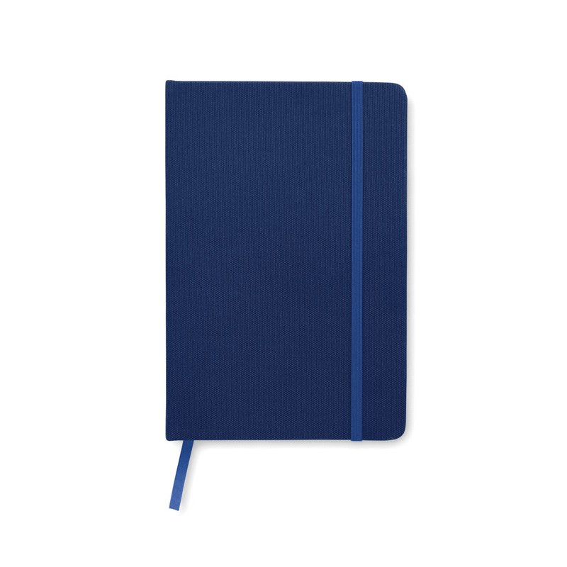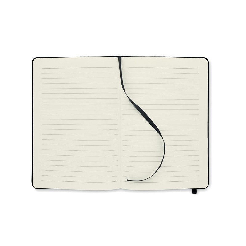A5 bilježnica s tvrdim 600D RPET koricama. Vezan za kućište. 160 stranica recikliranog papira s linijama (80 listova). Odgovarajuća elastična traka za zatvaranje i oznaka s vrpcom.