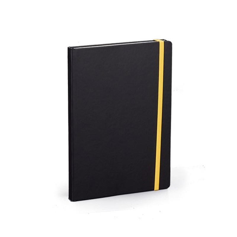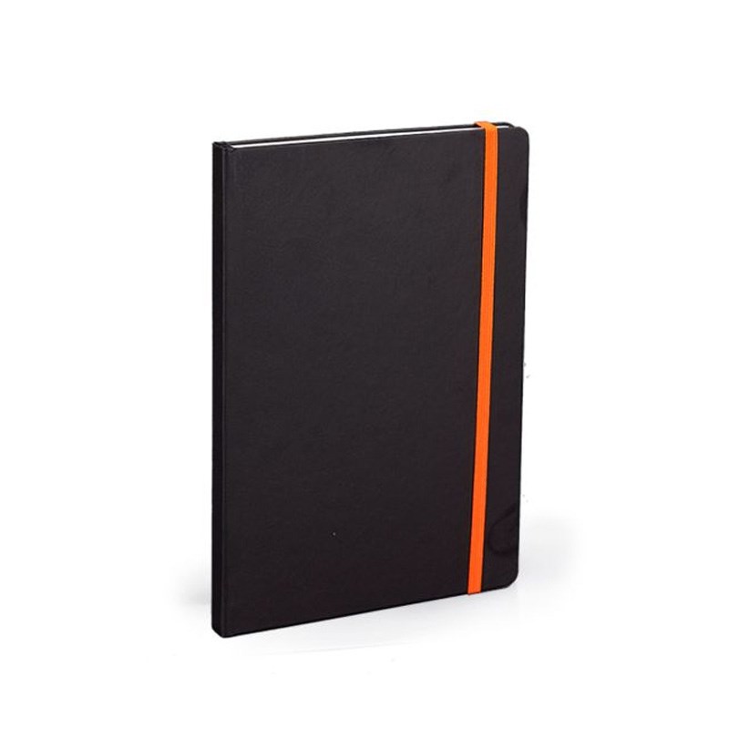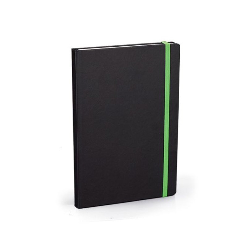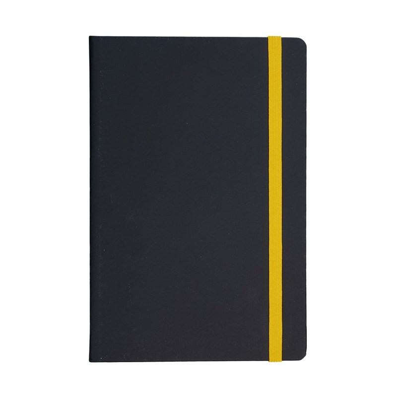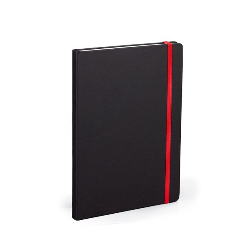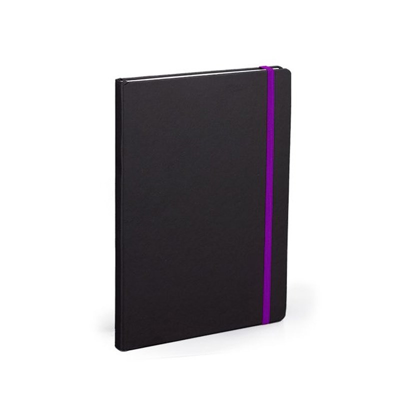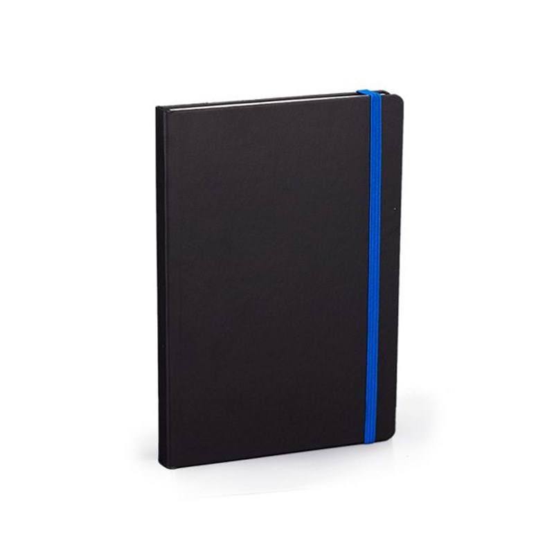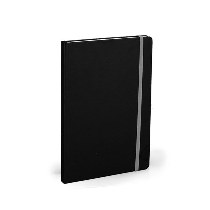 Notes A5 (14x21 cm) zaobljeni kutevi, 192 stranice bijeli 80gr. papir, crte + poč. stranica za osobne podatke, crne korice pogodne za tisak, gumica za zatvaranje raznim bojama.