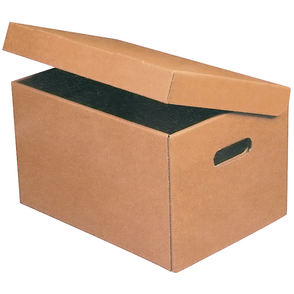 Arhivska kutija s rukohvatima, za odlaganje raznih dokumenata ili predmeta. Troslojni valoviti karton.