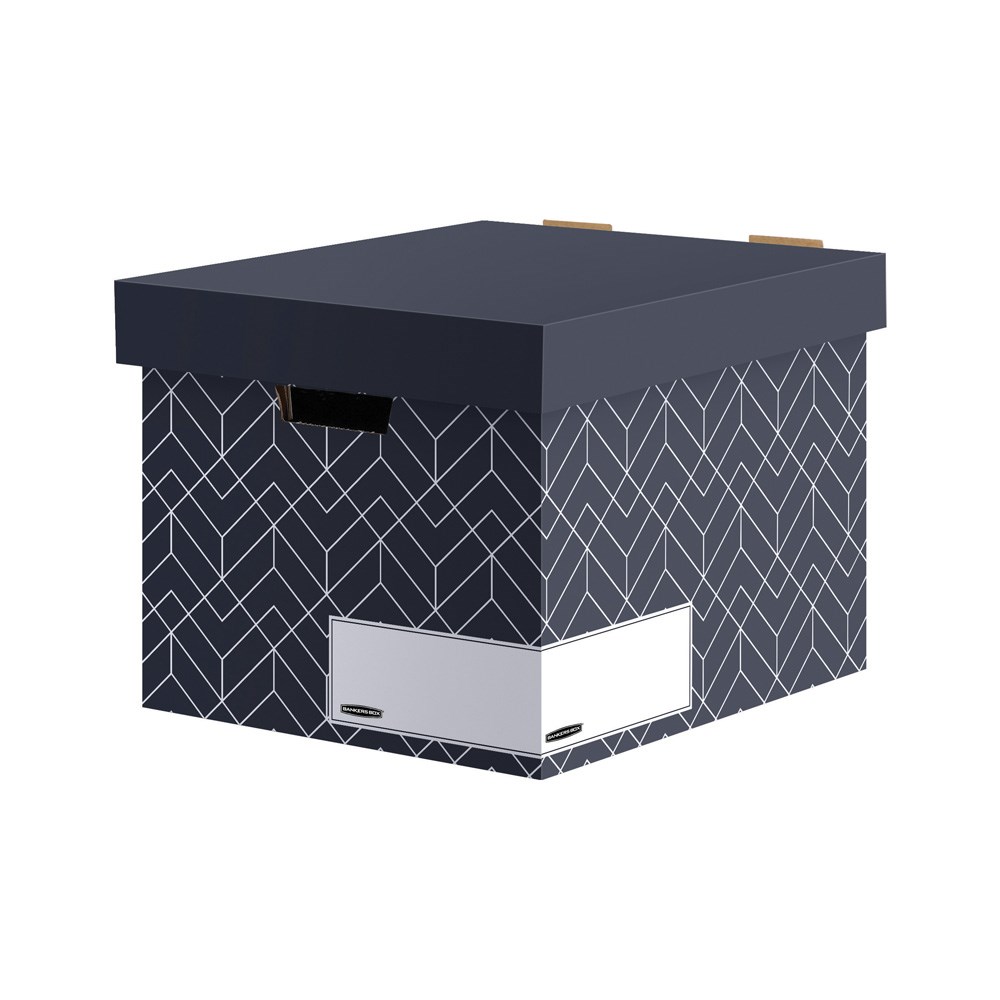 Elegantna i čvrsta kutija idealna za moderan ured na poslu i kod kuće. Čvrsti valoviti karton s modernim tiskom. Pojačane ručke. Od kartona s certifikatom FSC®. U potpunosti se može reciklirati.