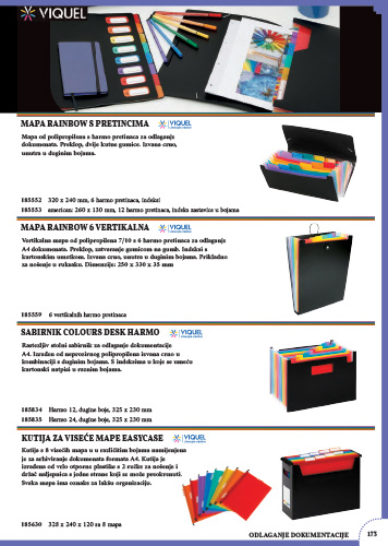 Kutija s 8 visećih mapa u u različitim bojama namijenjena je za arhiviranje dokumenata formata A4. Kutija je izrađena od vrlo otporne plastike s 2 ručke za nošenje i držač naljepnica s jedne strane koji se može preokrenuti. Svaka mapa ima oznake za lakšu organizaciju.