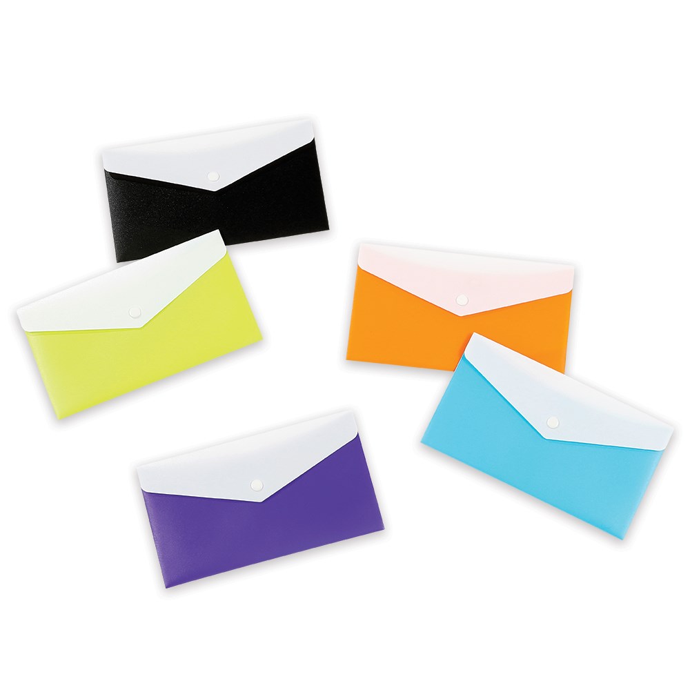 Kuverta ''kao pismo'' od mat polipropilena 2/10 u raznim bojama, zatvaranje bijela klapna s gumbom. Straga dodatni džep u punoj veličini.