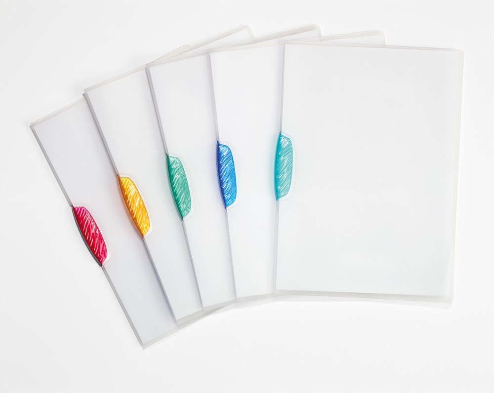 Polipropilenski fascikl, mlječno proziran, za ulaganje 1-30 listova A4 papira. Zatvarač (clip) u boji.