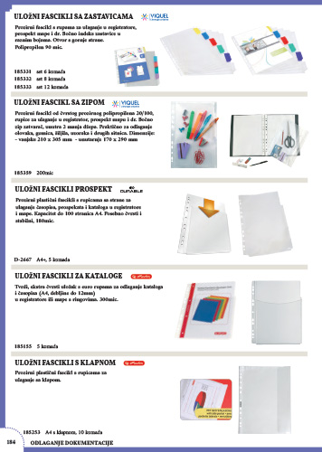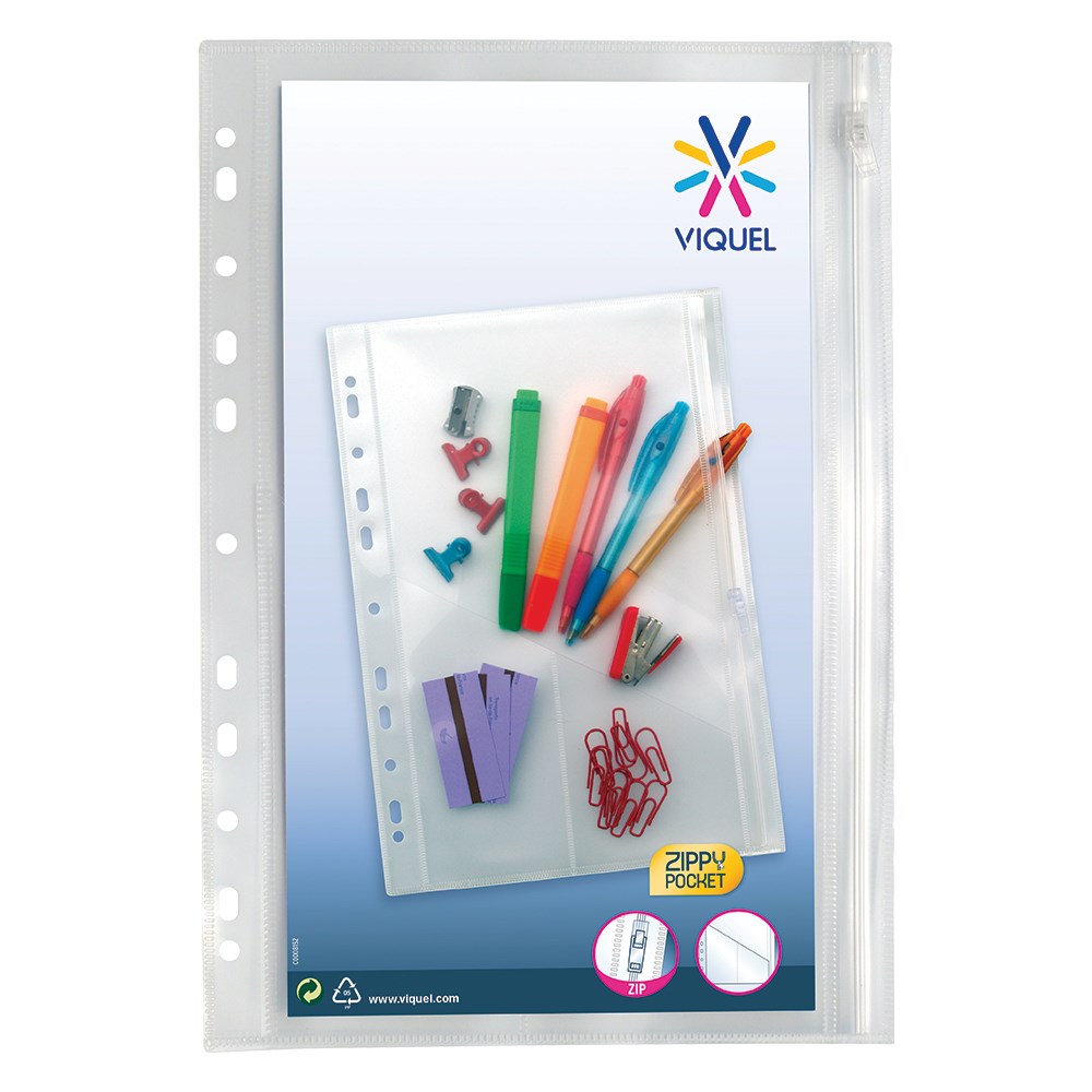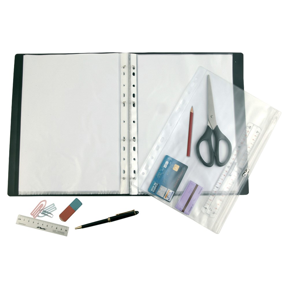 Prozirni fascikl od čvrstog prozirnog polipropilena 20/100, rupice za ulaganje u registrator, prospekt mapu i dr. Bočno zip zatvarač, unutra 2 manja džepa.