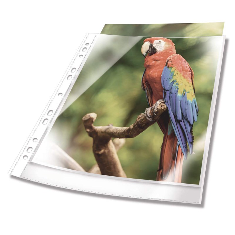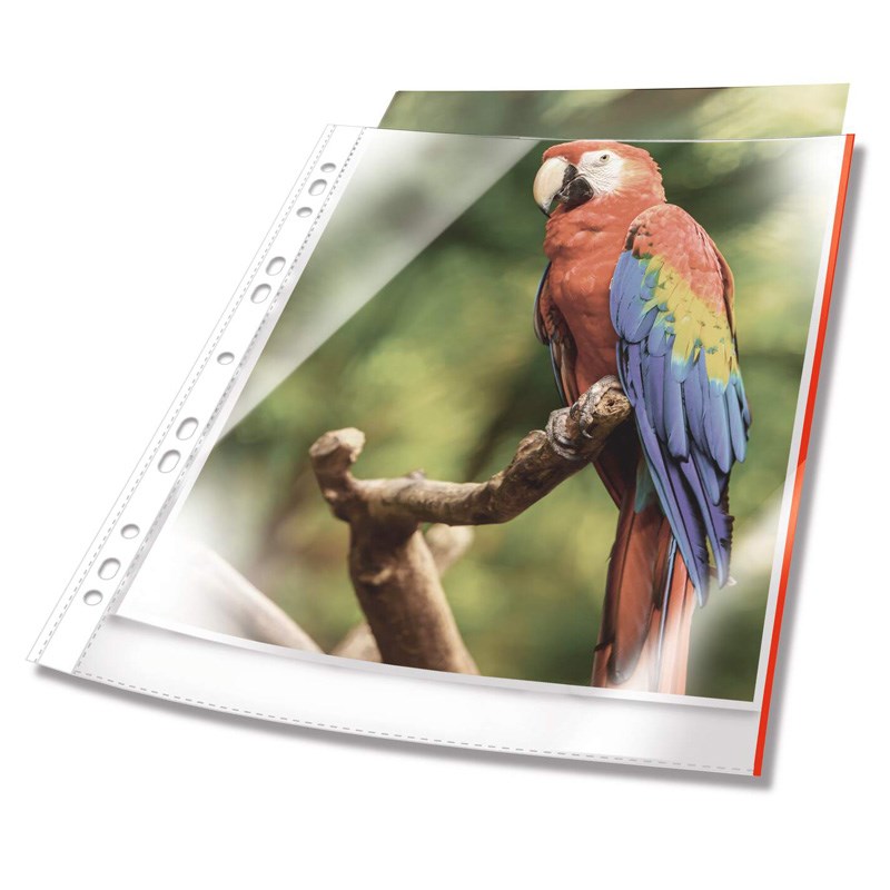 Uložni fascikl Premium kvalitete od 80 mµ s otvorom na vrhu i obojanim rubom od polipropilena. Kristalno prozirni i sigurni za kopiranje. S ojačanim univerzalnim rupama za arhiviranje u mape i registratore s prstenom.