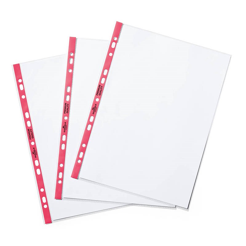 Prozirni fascikl od polipropilena 90 mikrona s rupicama za ulaganje u registratore ili prospekt mape, otvor s bočne strane gdje su rupice. Mat, s trakom za pojačanje u crvenoj boji.