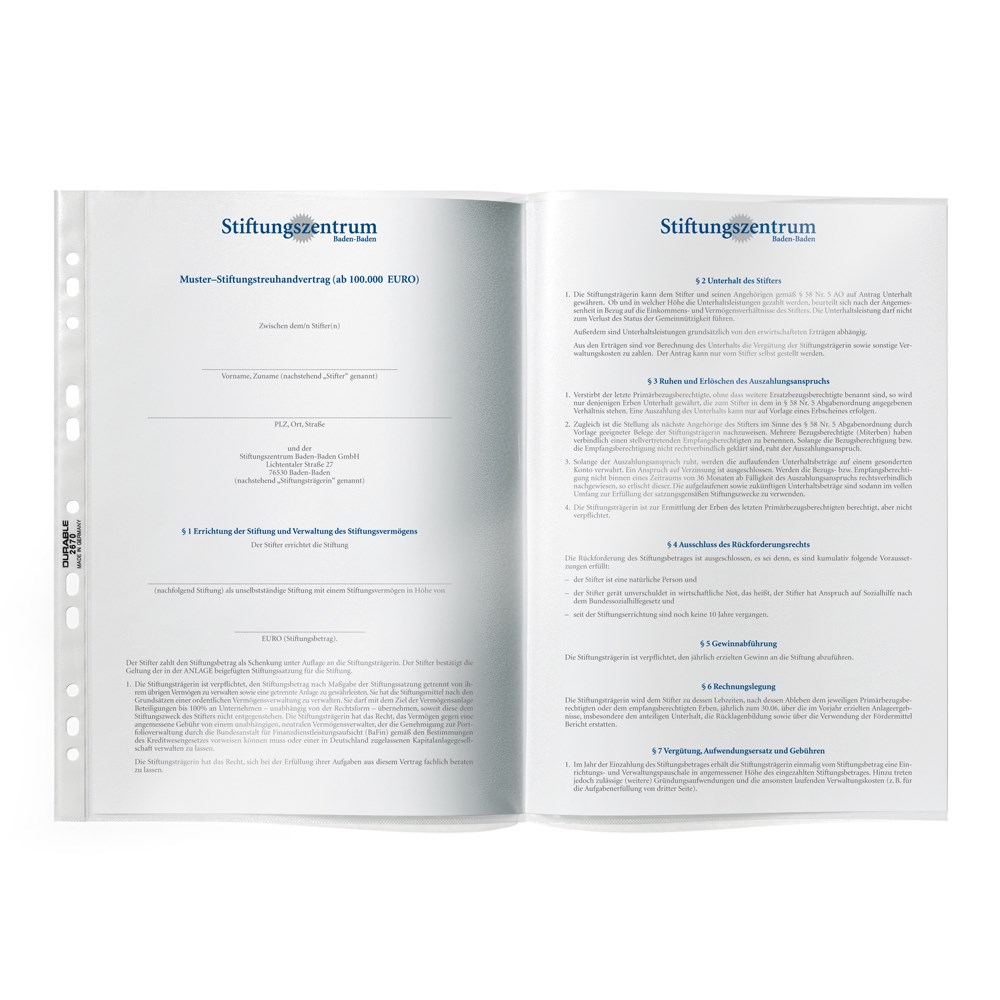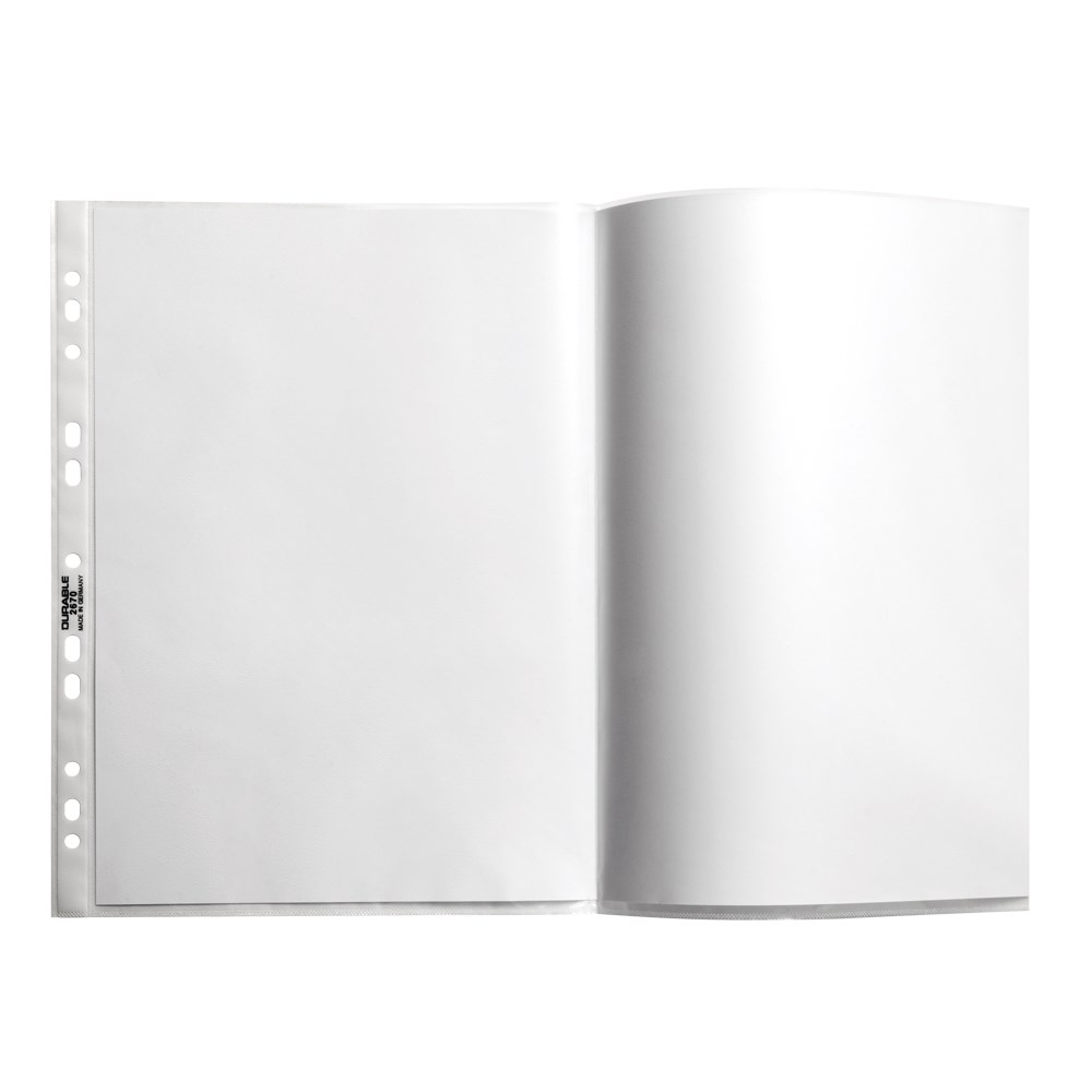 Prozirni fascikl od polipropilena s rupicama za ulaganje u registratore ili prospekt mape, otvor s gornje strane. Format A3 - za ulaganje papira 420x297 mm (2xA4). Sklopljen dolazi na format A4.