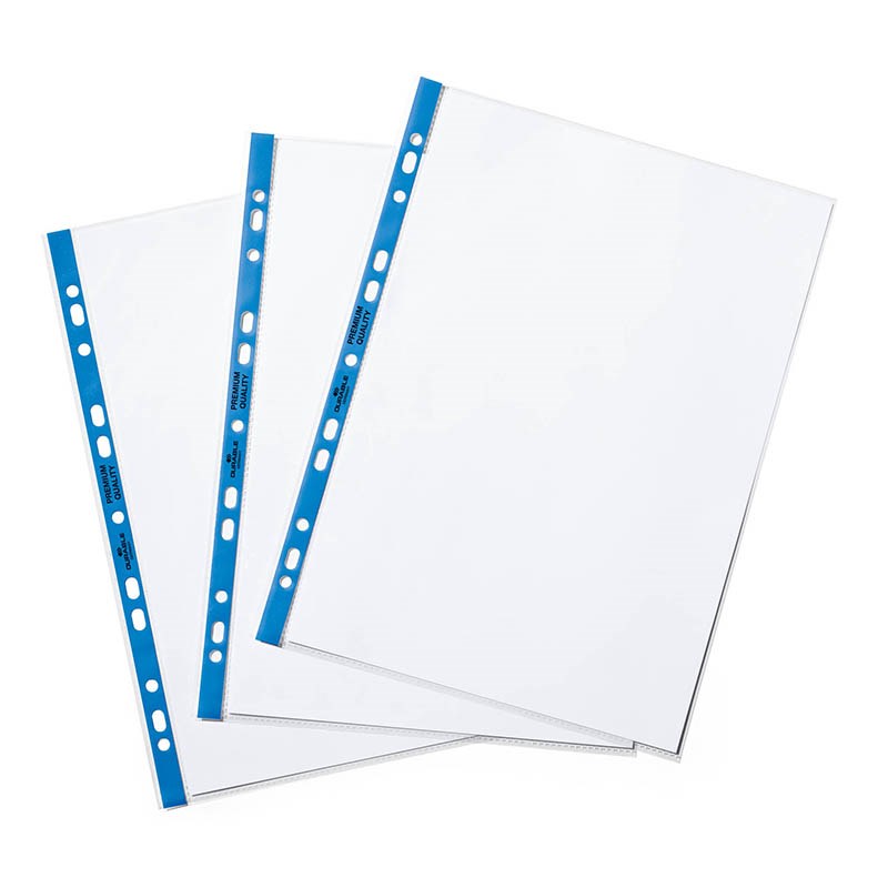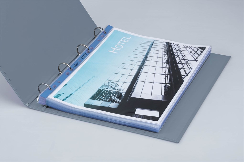 Prozirni fascikl od polipropilena 90 mikrona s rupicama za ulaganje u registratore ili prospekt mape, otvor s gornje strane. Mat, s trakom za pojačanje u plavoj boji.