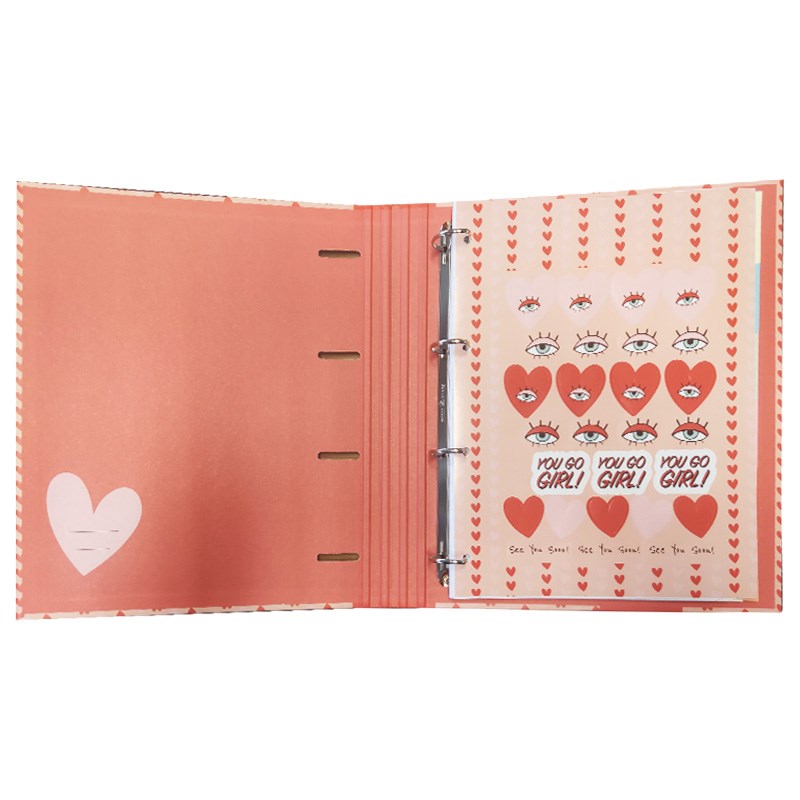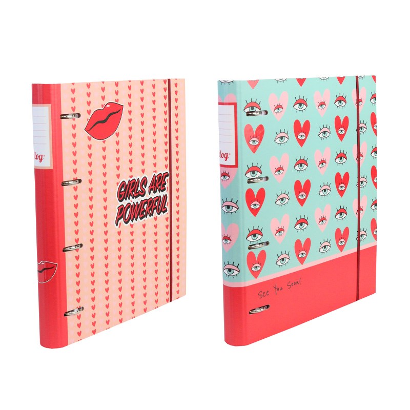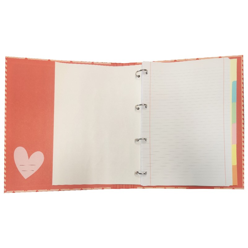 Sadrži 4 ringa, umetnuti blok papira A4 s crtama, indeks pregrade. Lako umetanje i vađenje bušenih listova, UR košuljica i drugog. Zatvaranje gumicom.