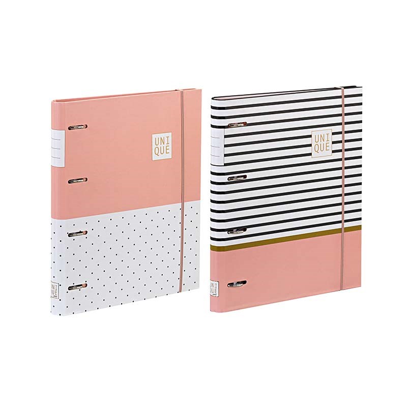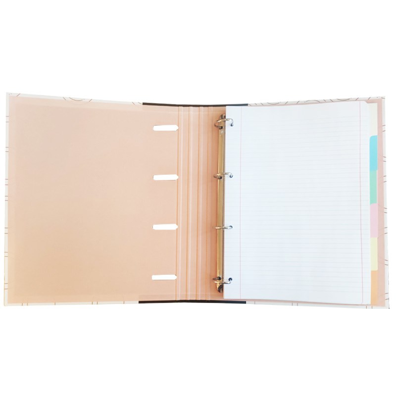 Sadrži 4 ringa, umetnuti blok papira A4 s crtama, indeks pregrade. Lako umetanje i vađenje bušenih listova, UR košuljica i drugog. Zatvaranje gumicom.