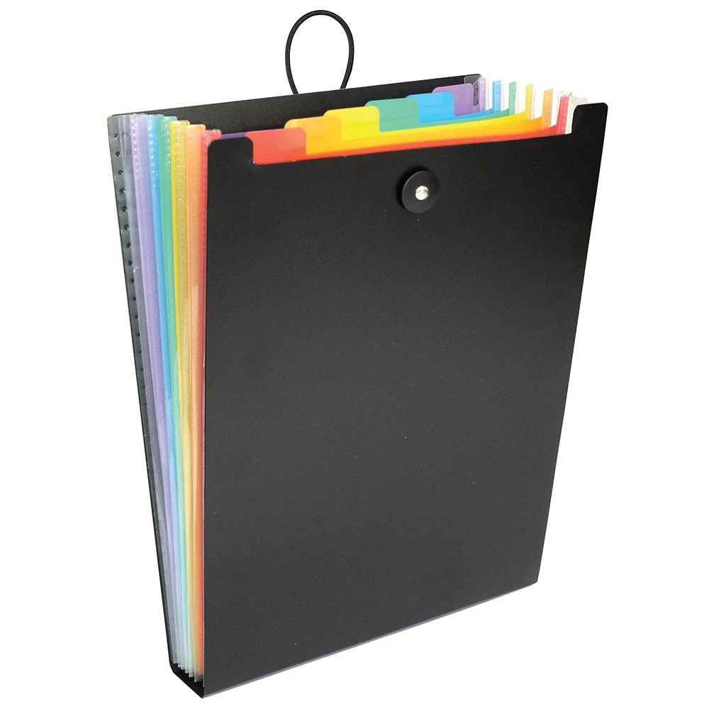 Vertikalna mapa od polipropilena 7/10 s 6 harmo pretinaca za odlaganje dokumenata. Preklop, zatvaranje gumicom na gumb. Indeksi s kartonskim umetkom. Izvana crno, unutra u duginim bojama. Prikladno za nošenje u ruksaku.