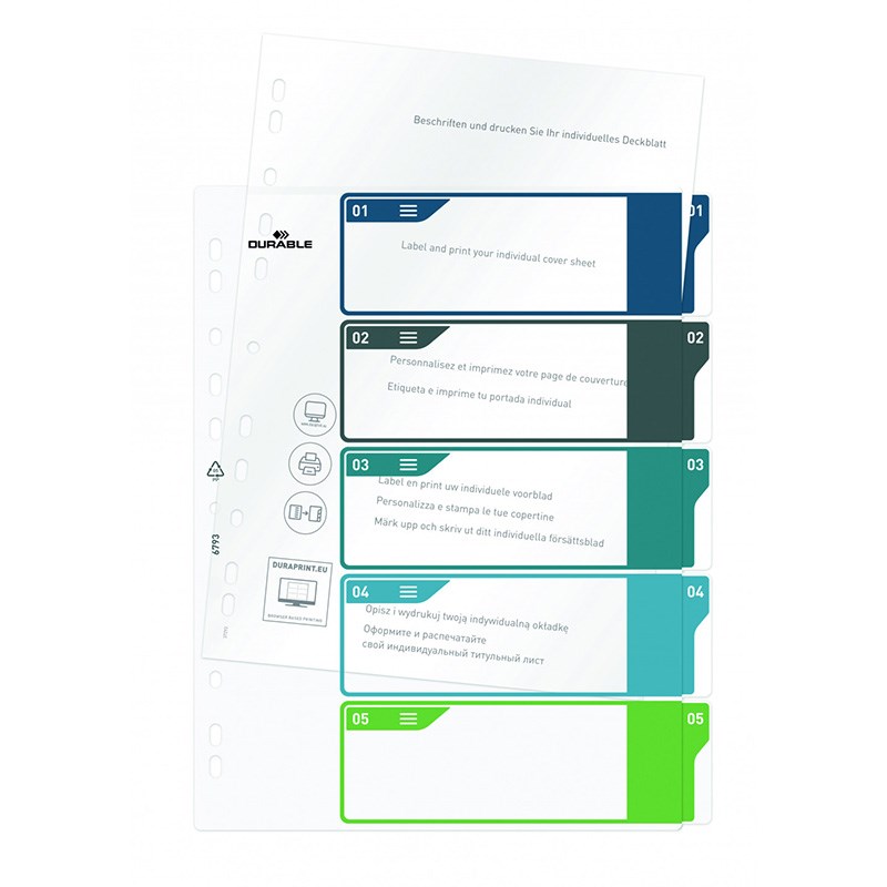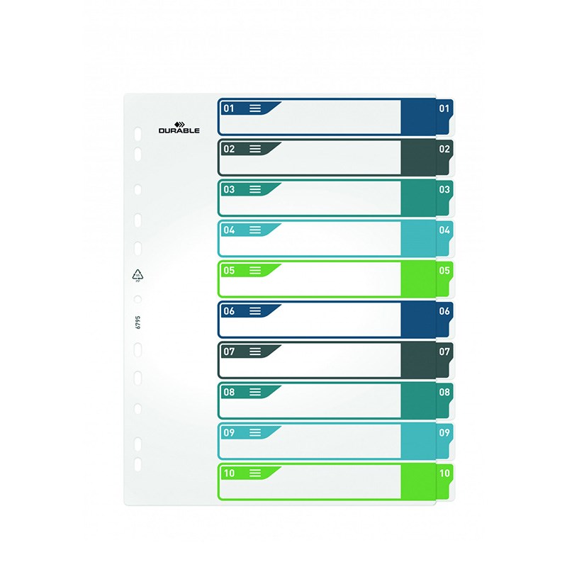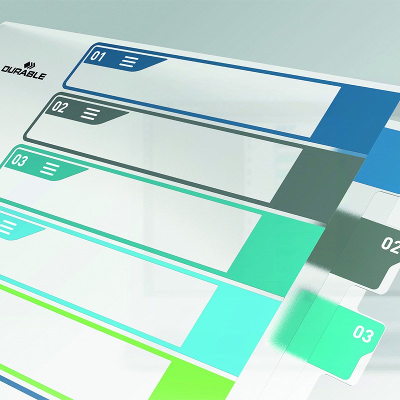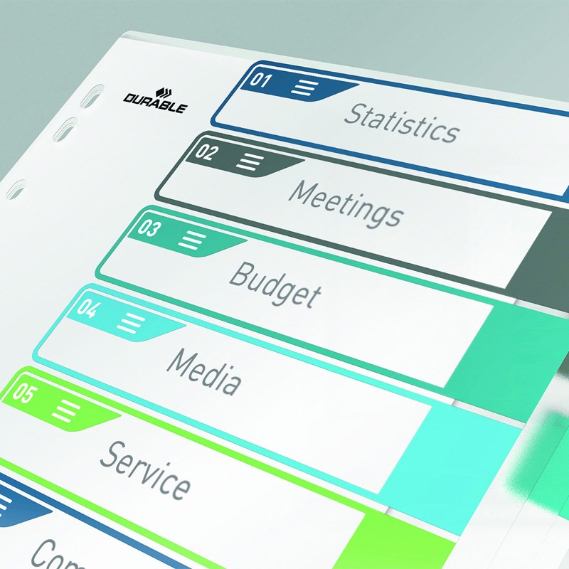 Pregradni registar od polipropilena s indeks oznakama u više boja. Transparentna naslovnica omogućuje višekratnu upotrebu, a zamjenjivi indeks list može se pojedinačno ispisati i spremiti iza naslovnice. Visoka kvaliteta i otpornost na trganje. Univerzalno bušenje za jednostavnu pohranu u registratore. Sigurna za kopiranje. Format A4.