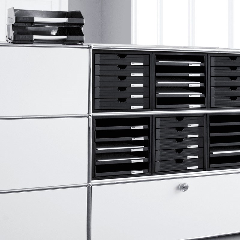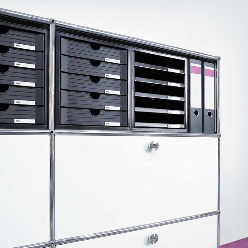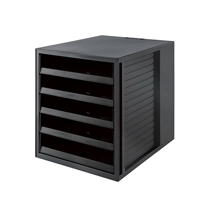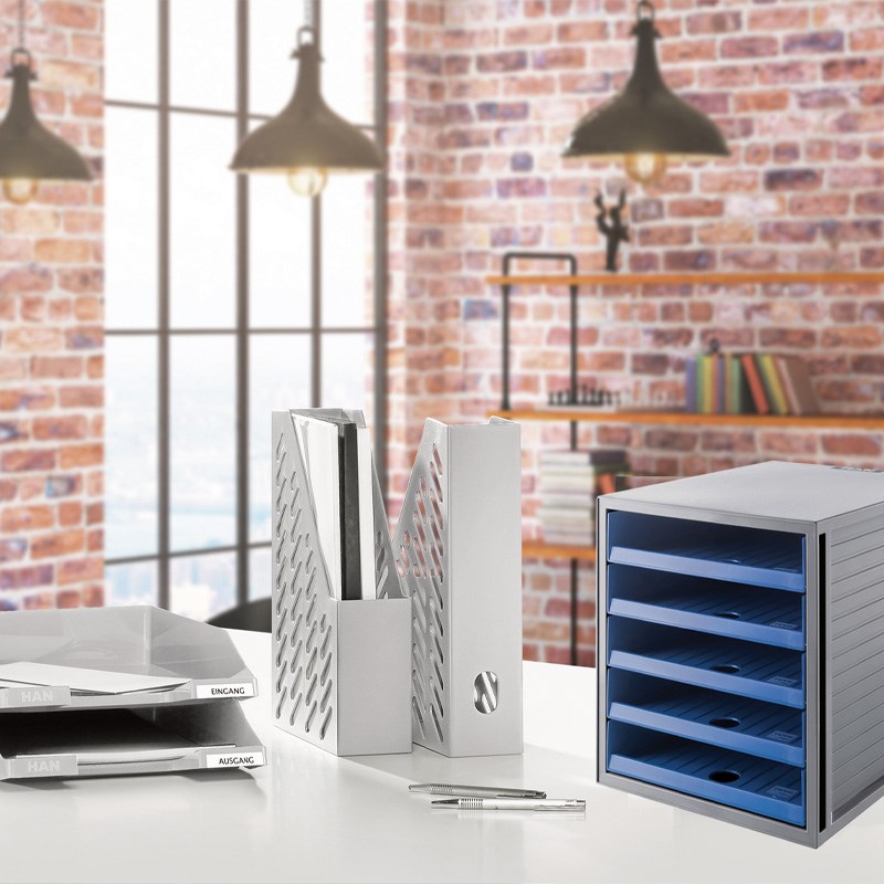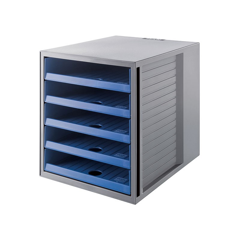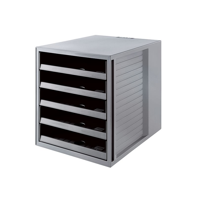Kutija s 5 otvorenih ladica od reciklirane plastike s Blue Angel certifikatom. Stabilno svjetlo sivo kučište s gumenim podlošcima protiv klizanja, ladice za papir formata A4+ visine 45 mm s kočnicom protiv ispadanja i indeksom sadržaja. Vanjska visina i dubina usklađene su s veličinom mapa, točnije s veličinom polica u uredskim ormarićima, te se stoga lako mogu smjestiti u ormariće