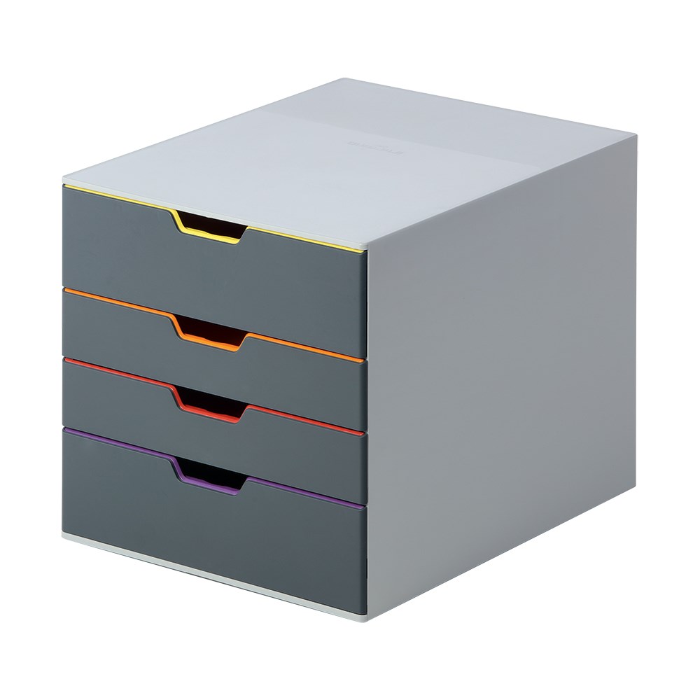 Siva kutija s 4 regular ladice u različitim živim bojama unutrašnjosti i rubova. Visoko kvalitetna plastika, glatko i bešumno otvaranje s zaustavljačem, promjenjiv natpis sadržaja ladice, protuklizna podloga.