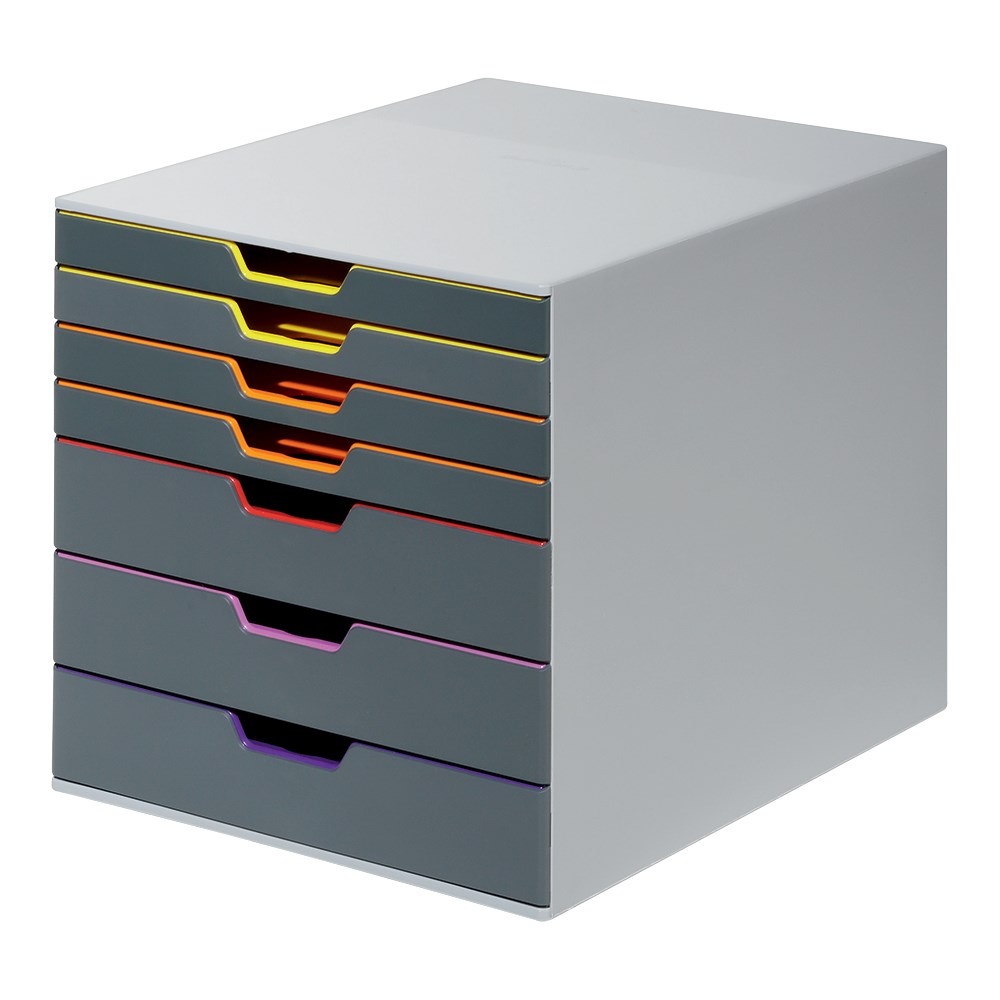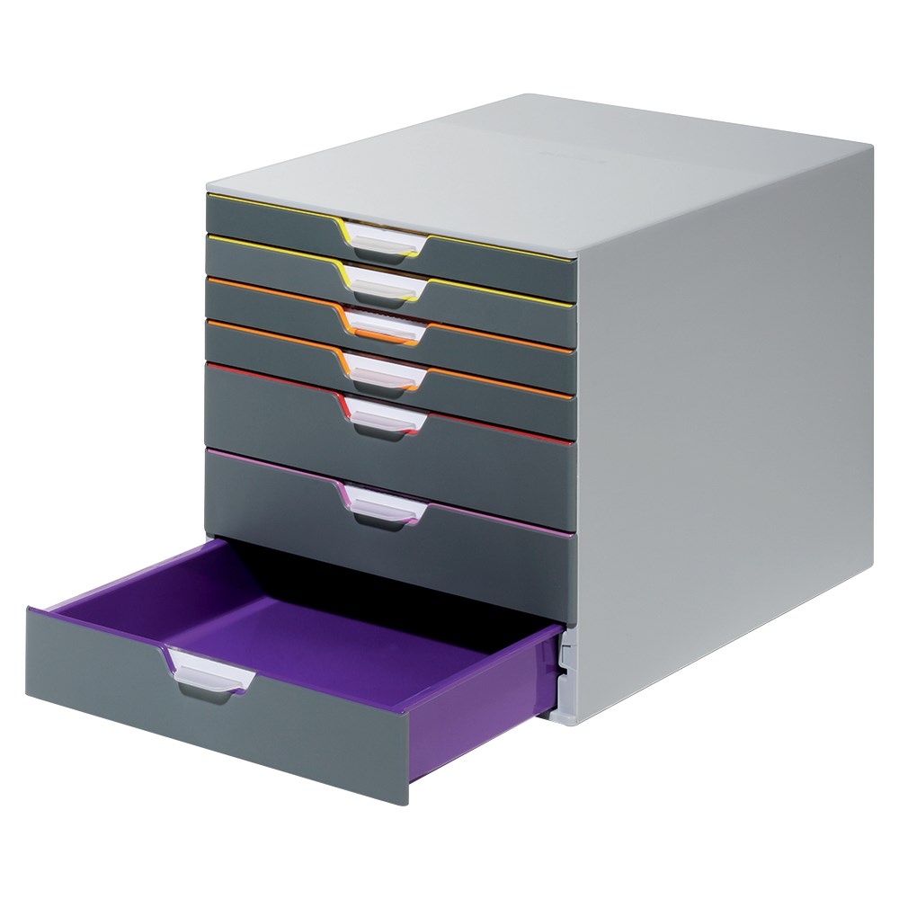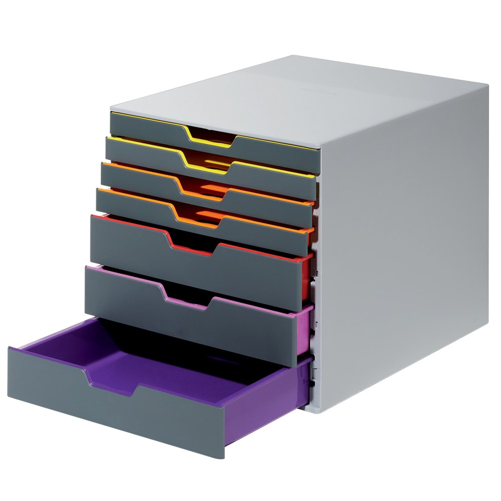 Siva kutija s 3 regular + 4 slim ladice u različitim živim bojama unutrašnjosti i rubova. Visoko kvalitetna plastika, glatko i bešumno otvaranje s zaustavljačem, promjenjiv natpis sadržaja ladice, protuklizna podloga.