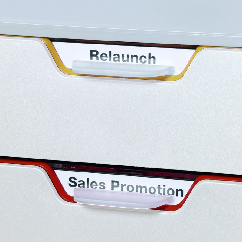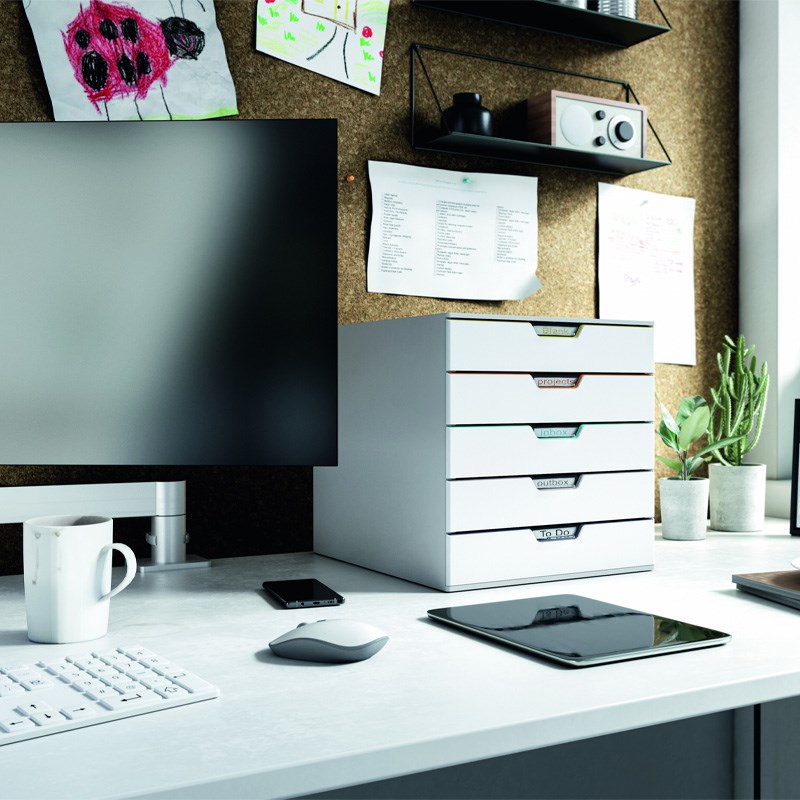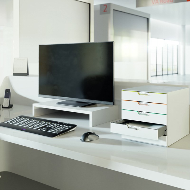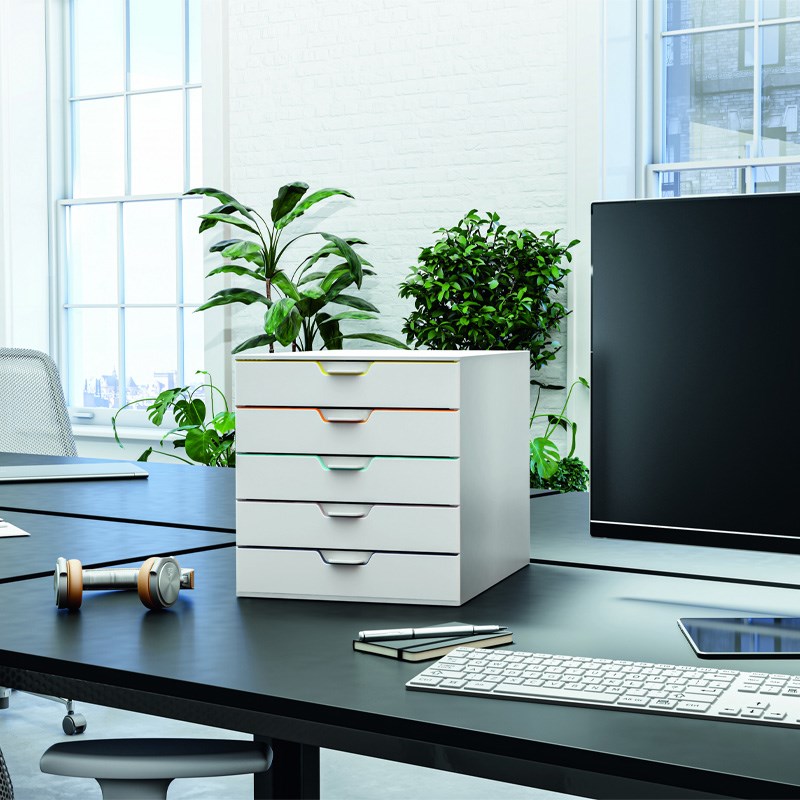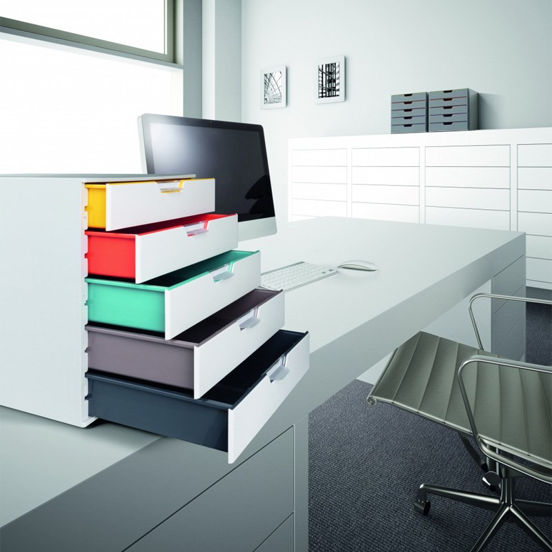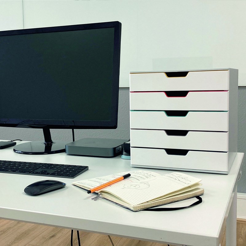 Bijela kutija s 5 ladica u različitim živim bojama unutrašnjosti i rubova. Visoko kvalitetna plastika, glatko i bešumno otvaranje s zaustavljivačem. Protuklizna podloga.