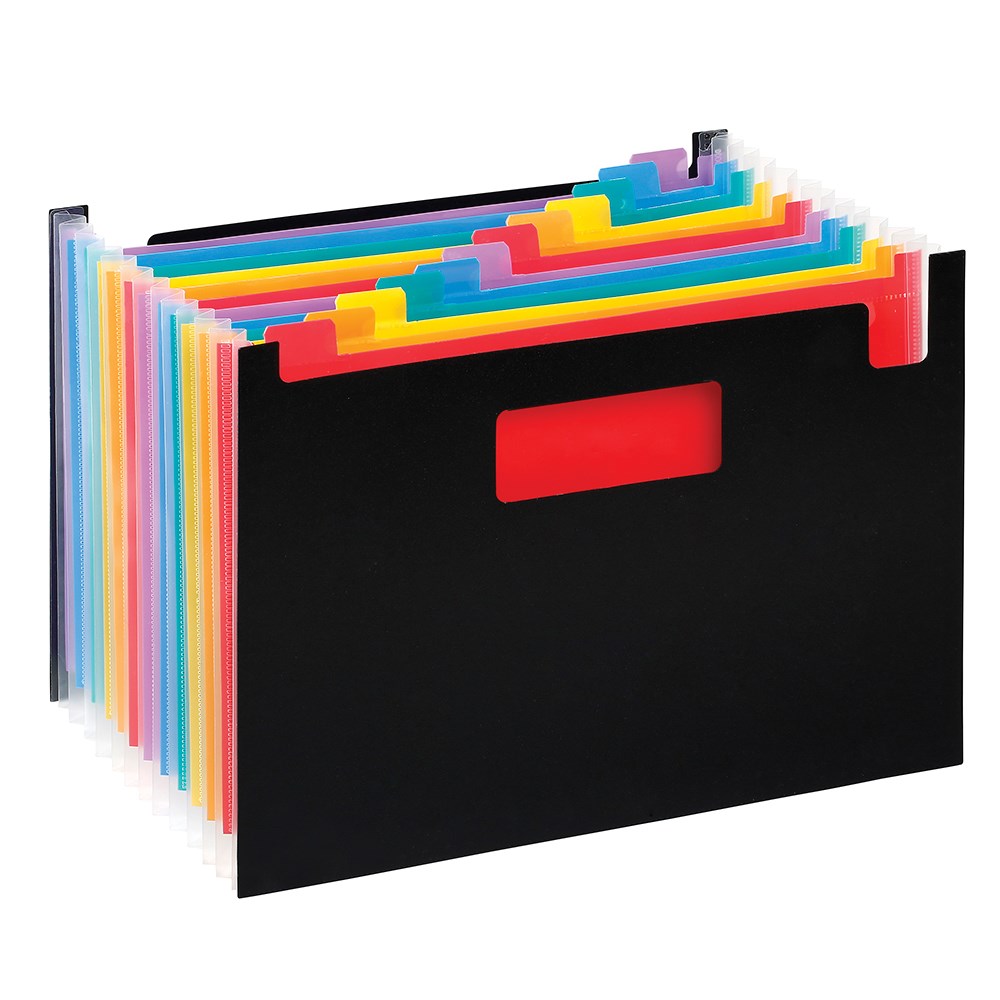 Rastezljiv stolni sabirnik za odlaganje dokumentacije A4, 2 ručke za nošenje. Izrađen od neprozirnog polipropilena 7/10, izvana crno, unutra pregrade u duginim bojama s indeksima u koje se umeću kartonski natpisi u raznim bojama.