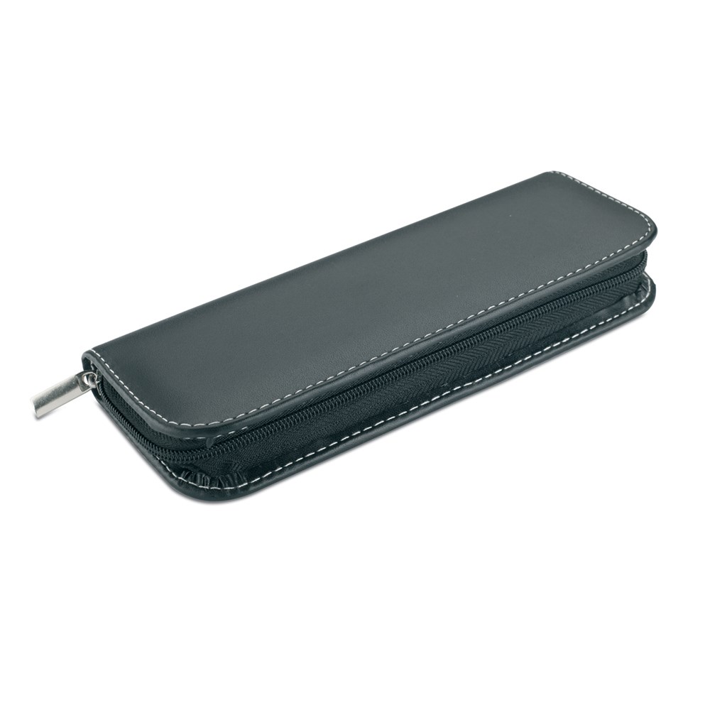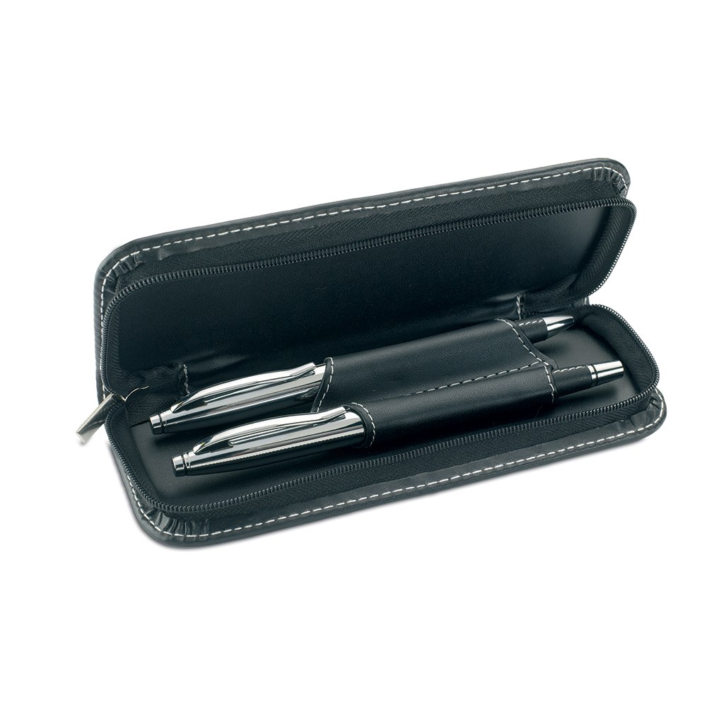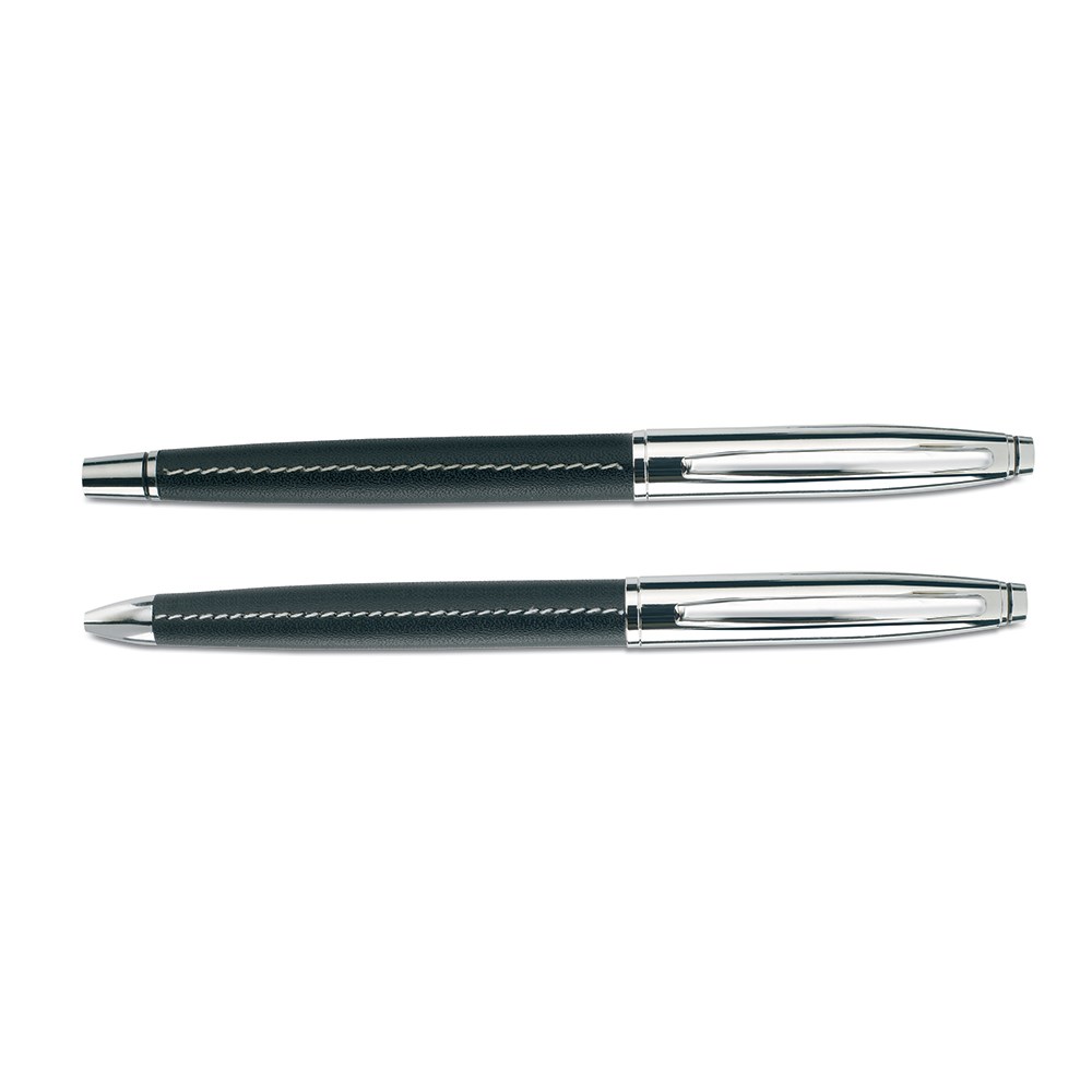 Metalna kemijska olovka i roler u etuiu od umjetne kože, zatvaranje cifom. Plavi i crni ispis.