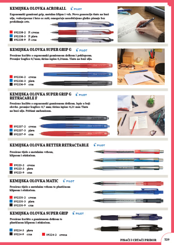 Prozirno tijelo s metalnim vrhom, klipsom i stiskačem. Tinta na bazi ulja koja pruža glatko pisanje. Olovka sadrži vrh od nehrđajućeg čelika i kuglu od volframovog karbida koji pomažu u otpornosti na habanje i pružaju dugotrajnu trajnost. spis u boji olovke.