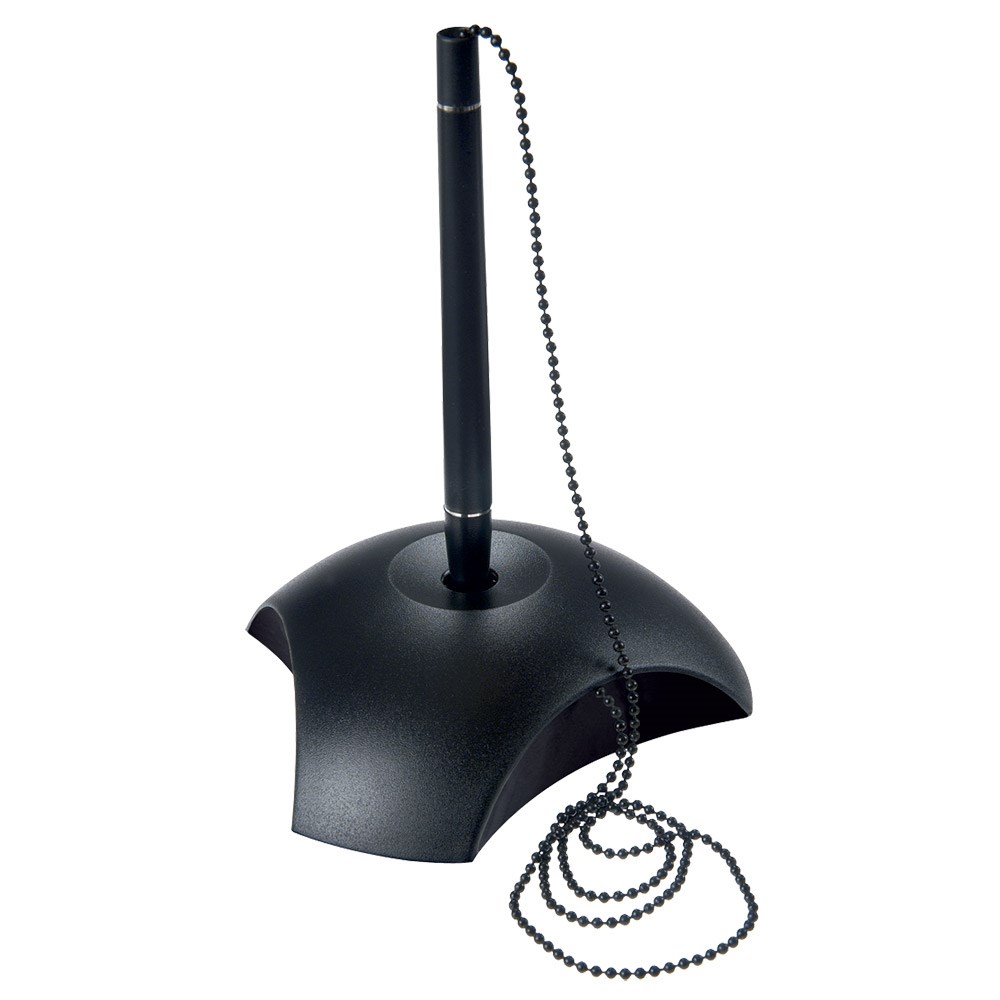 Kemijska olovka s metalnim lančićem duljine 55 cm. Postolje elegantnog izgleda od kompaktne plastike, s gumenim protukliznim podlošcima.