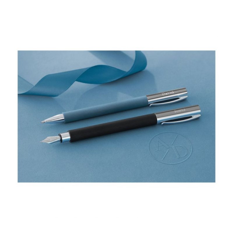 Elegantna kemijska olovka tijela izrađenog od brušene plave smole, vrh i klipsa od visoko poliranog metala. Širina ispisa 0,6 mm; okretni mehanizam; ispis: crni; u poklon kutiji.