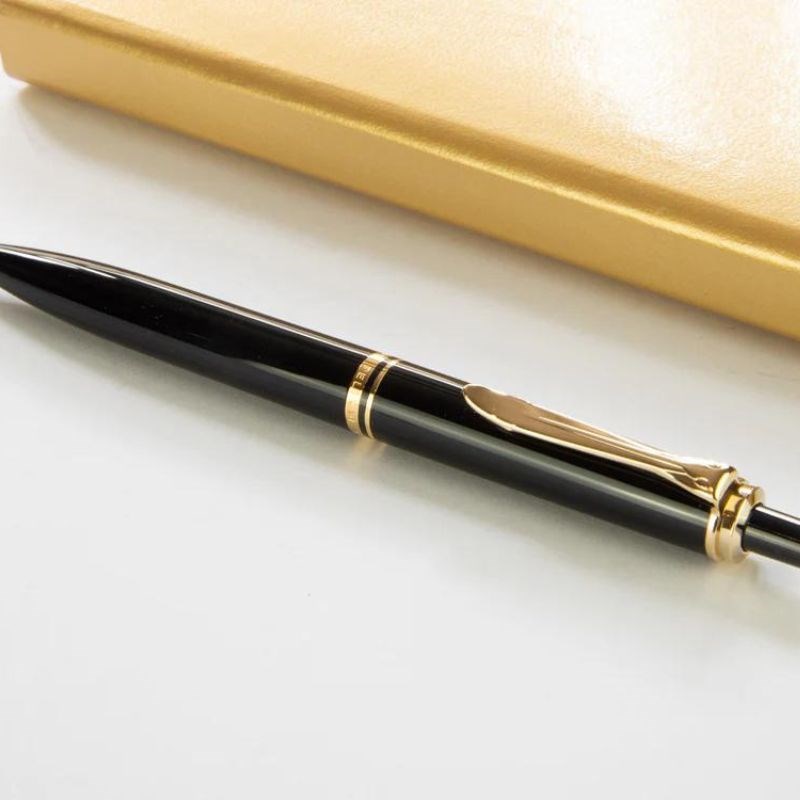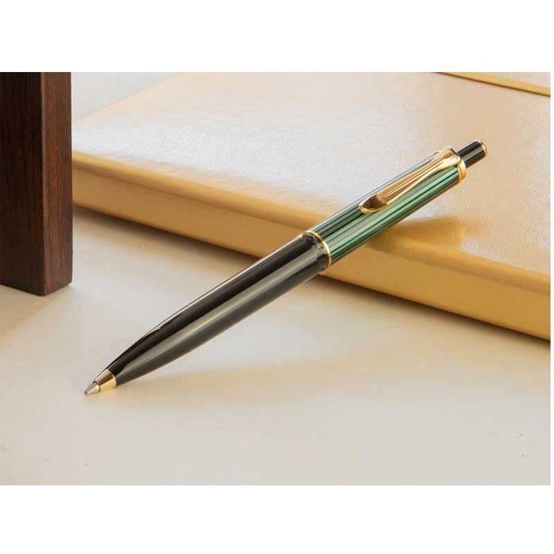 Pelikan Souverän ® K400 kemijska olovka s tijelom izrađenim od visokokvalitetne smole brušene dijamantom i 24-karatnim pozlatom. Prepoznatljivo prugasto tijelo izrađuje se prema recepturi razvijenoj posebno za Pelikan, od pamučnog materijala u u više koraka izrađuje prugasti komad materijala koji se savija, brusi i potom dijamantom reže po konturi. Pozlaćeni prstenovi na gornjem i donjem dijelu postavljeni su s najvećom preciznošću, stvarajući gotovo besprijekoran prijelaz između materijala prije nego što se pisaći instrument polira do visokog sjaja. Blago elastična, tipična Pelikanova kopča za kljun daje ovom visokokvalitetnom pisaćem instrumentu nepogrešiv dizajn.