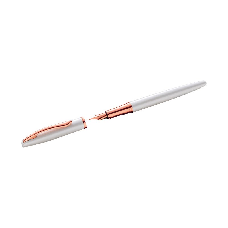 Metalno nalivpero s perom od poliranog nehrđajućeg čelika srednje širine linije. Kromirana klipsa, vrh i dekorativni prsten u istoj boji. Robusna i izdržljiva kopča. Lakirano tijelo s premazom za pearl efekt. Opremljen Pelikan velikim spremnikom s tintom, sistem punjenja uloška. U poklon kutiji.